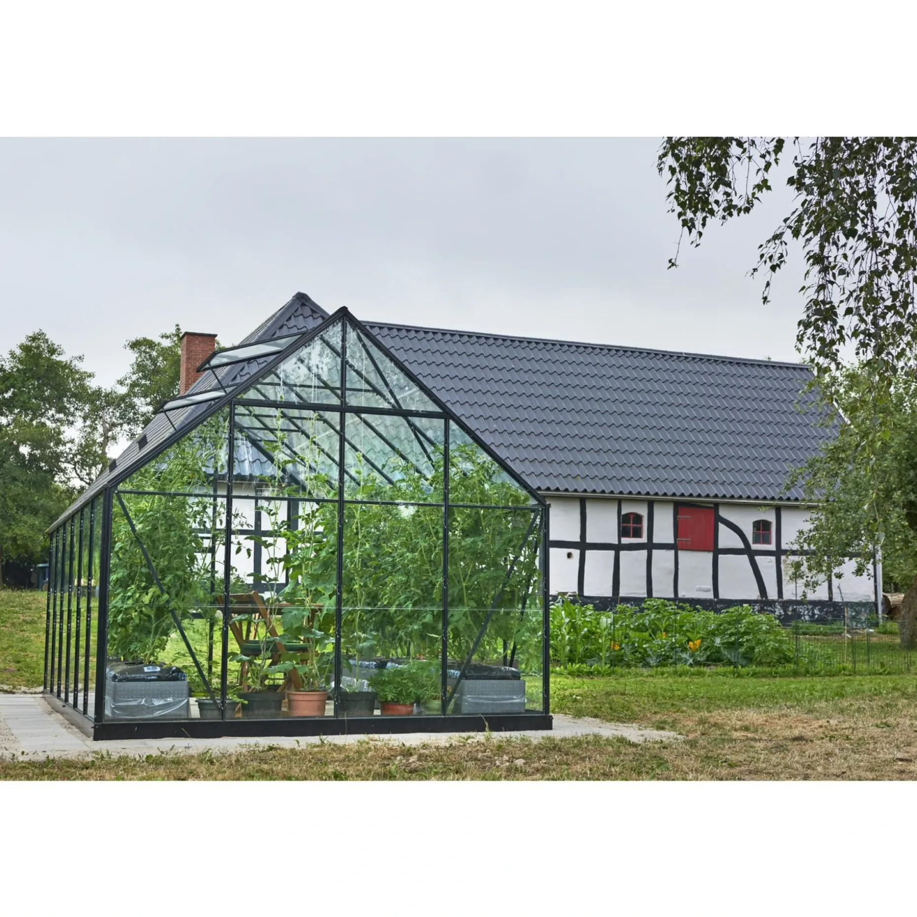 Om sommeren, når solen bager fra en skyfri himmel, bliver det ofte for varmt for planterne i drivhuset. Derfor har drivhuset to tagvinduer, så du let kan regulere temperaturen.