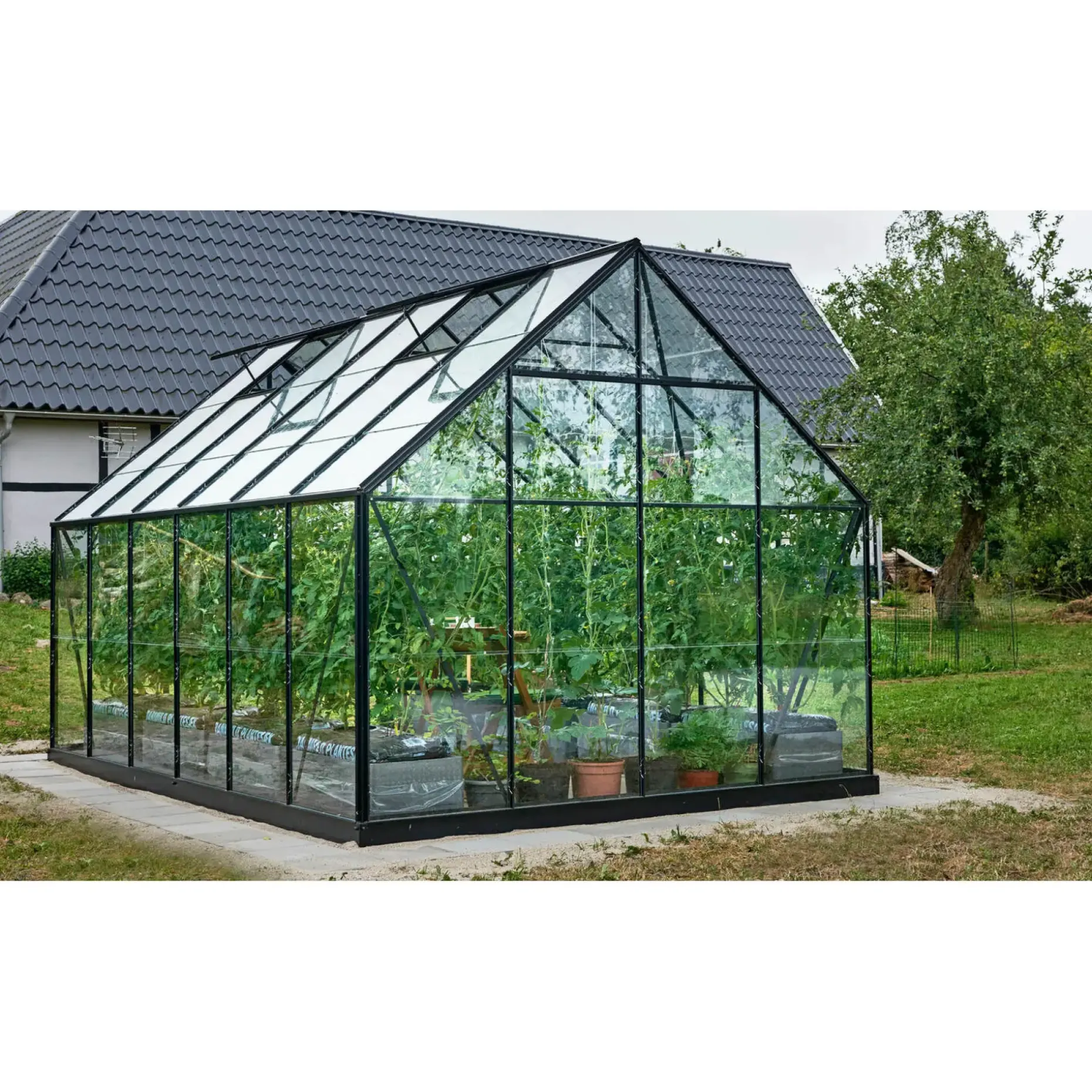 Drivhuset har en god højde, så du uden problemer kan stå opret midt i drivhuset, mens du ser til afgrøderne. Drivhusets samlede areal er 9,9 m2, så der er rigeligt med plads til at dyrke grøntsager, frugter og blomster.
