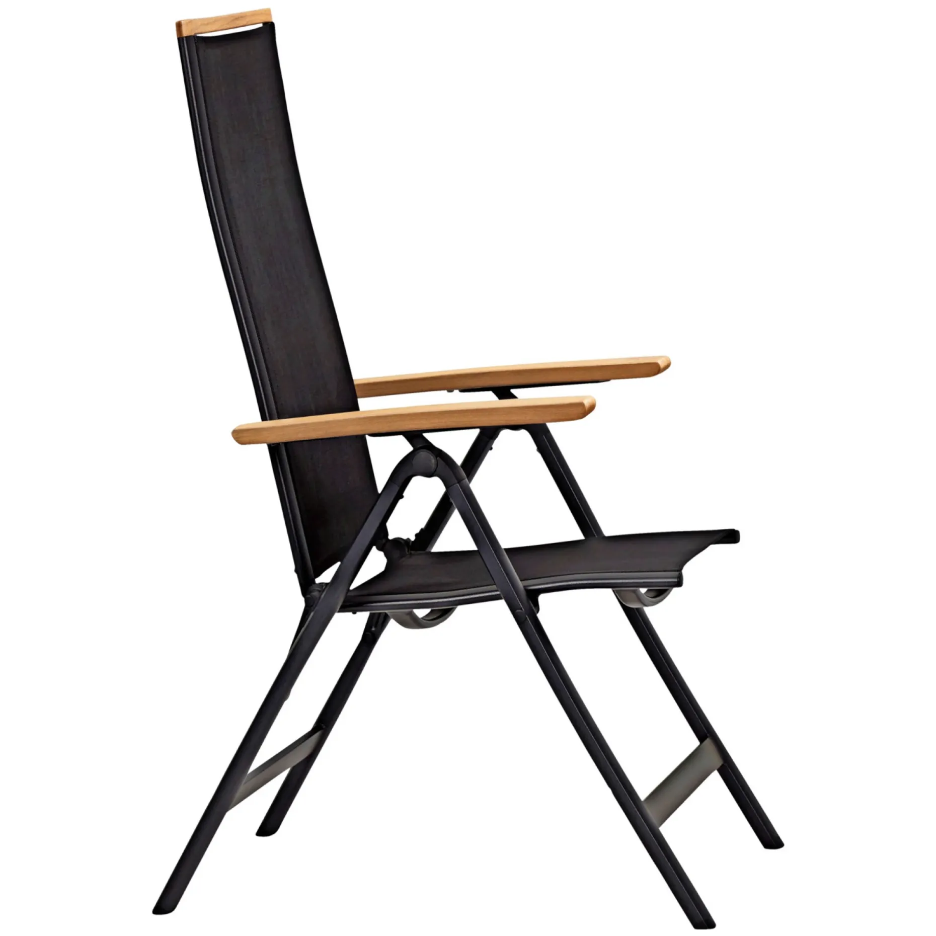 Armlæn og top på ryglænet er i aluminium, hvilket giver et stilrent og holdbart udtryk. Kombinationen af aluminium og texteline sikrer et enkelt design, der passer til forskellige uteområder.