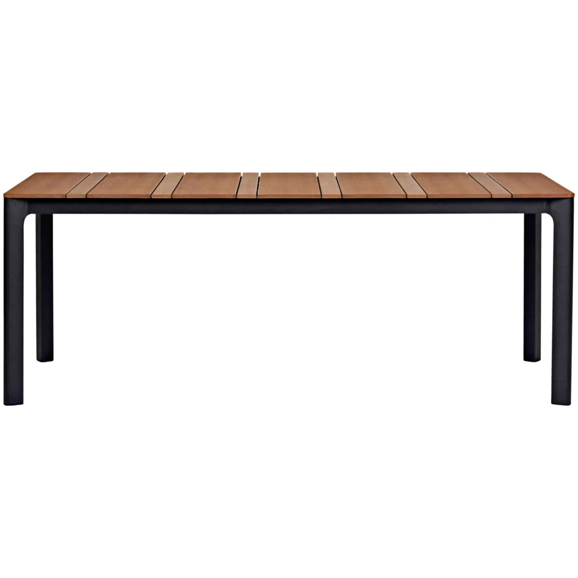 Havebordet er 90×199 cm med bordplade i naturfarvet nonwood og et sort pulverlakeret alustel. Materialerne kombinerer et vedligeholdelsesvenligt udseende med et let og robust understel i aluminium.