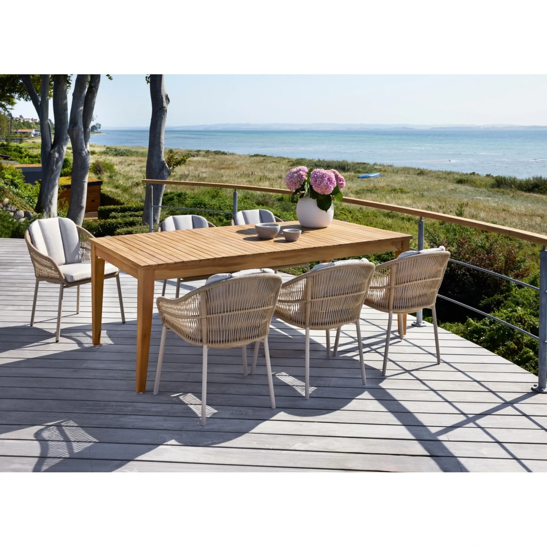 Alustellets konstruktive egenskaber bidrager til stabilitet, og kombinationen af teak og rebflet balancerer æstetik og funktion. Møblerne passer til terrasse, have eller overdækket uderum.