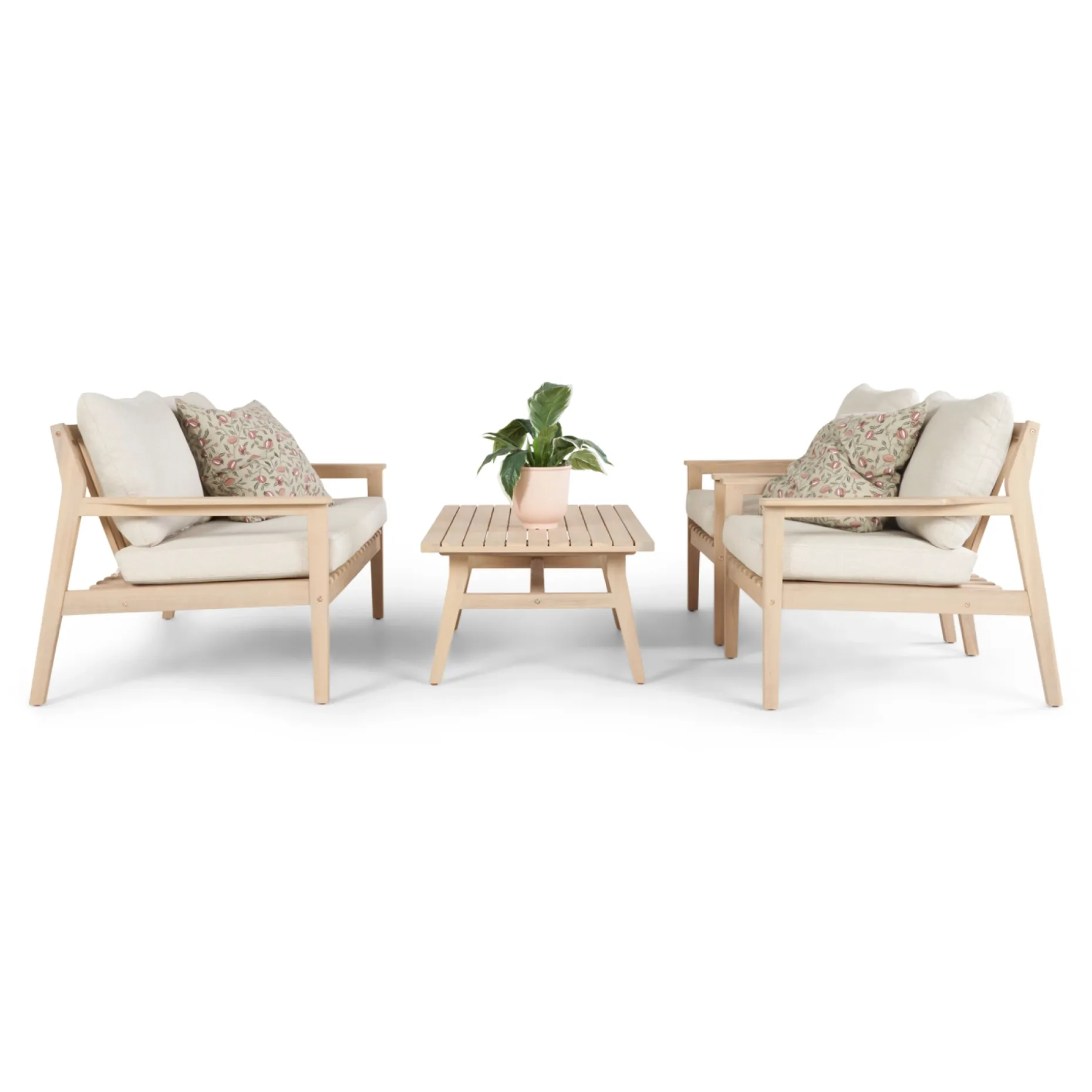 Hanoi sofasæt i akacietræ leveres inkl. hynder. Sættet indeholder en 2-pers. sofa, to stole og et bord, som tilsammen udgør en komplet siddegruppe. Hynderne medfølger og øger komforten ved længere ophold.