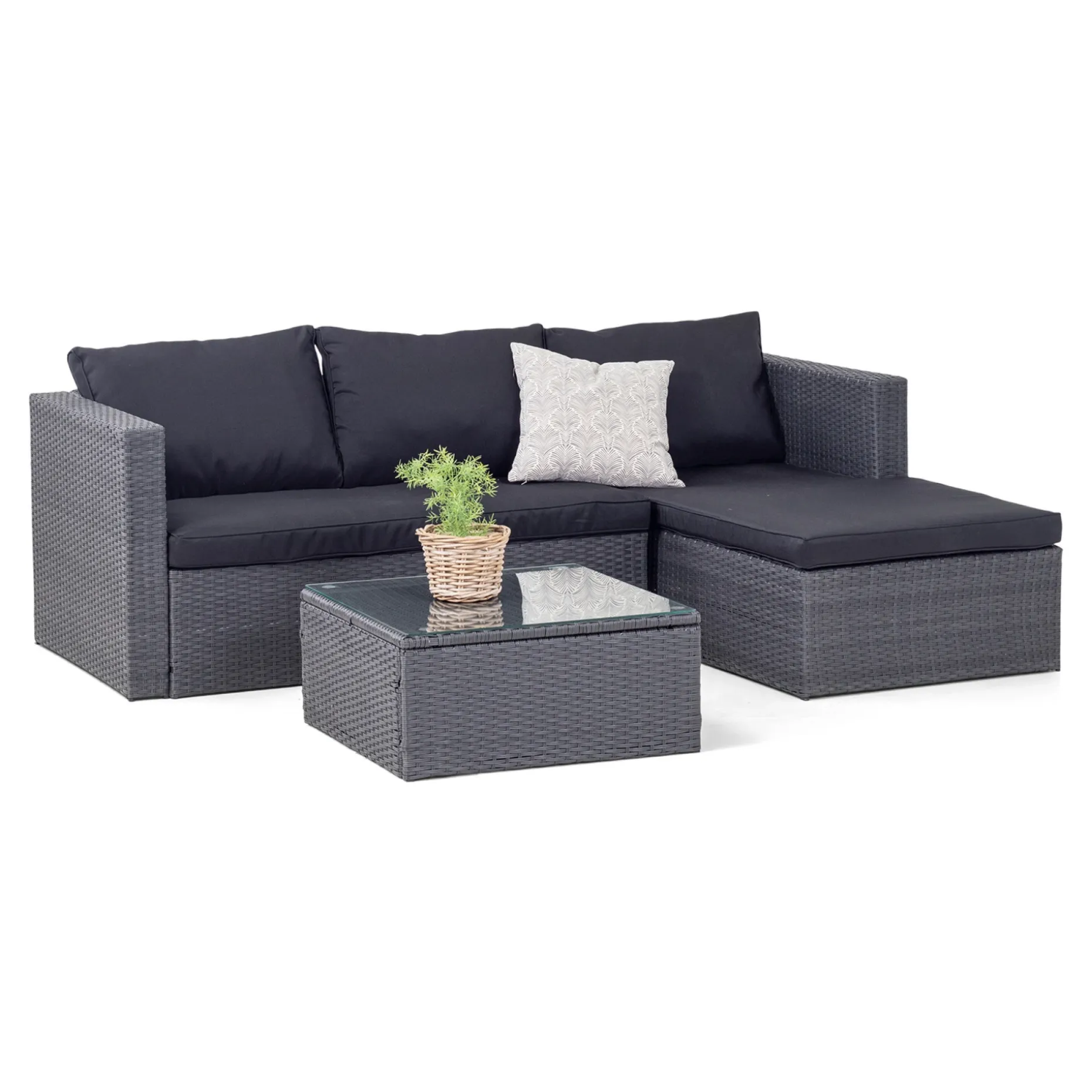Lækkert sofasæt fra Outrium bestående af en 2 personers sofa med chaiselong og et bord med glasplade. Sættet er i PE-flet, som er nemt at vedligeholde.