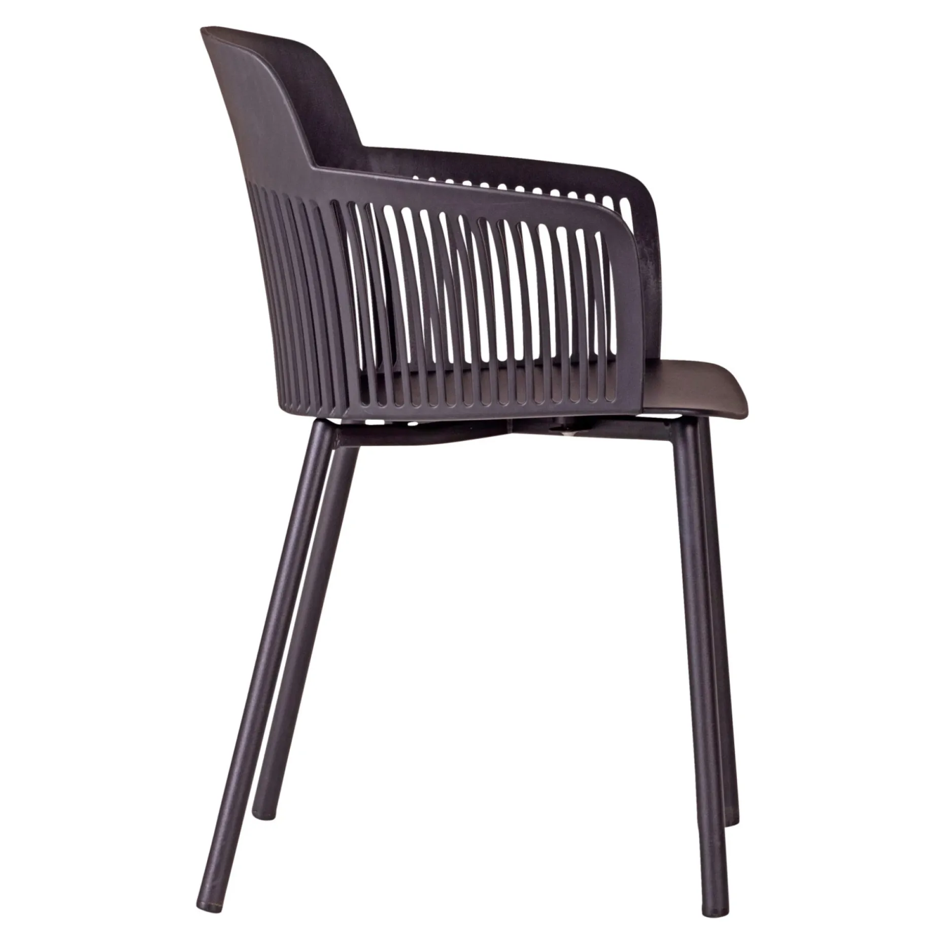 Denne havestol i sort plast med sorte stålben fra outrium er lavet i et stilrent og moderne design. Derved passer stolen til de fleste haveborde. Da stolen er lavet i plast, er den nem at flytte rundt efter behov.