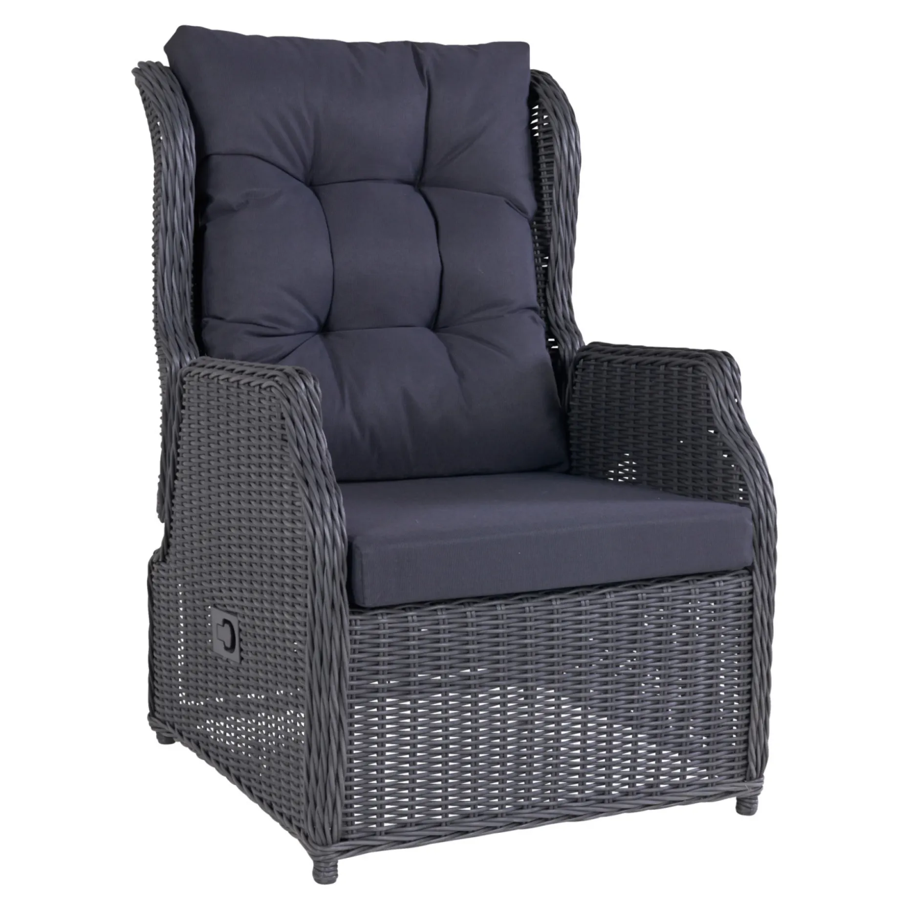 Luksuriøs og flot milano lænestol i halvrund sort PE-flet. Du har med denne lænestol mulighed for at ændre ryg positionen alt efter dine behov.