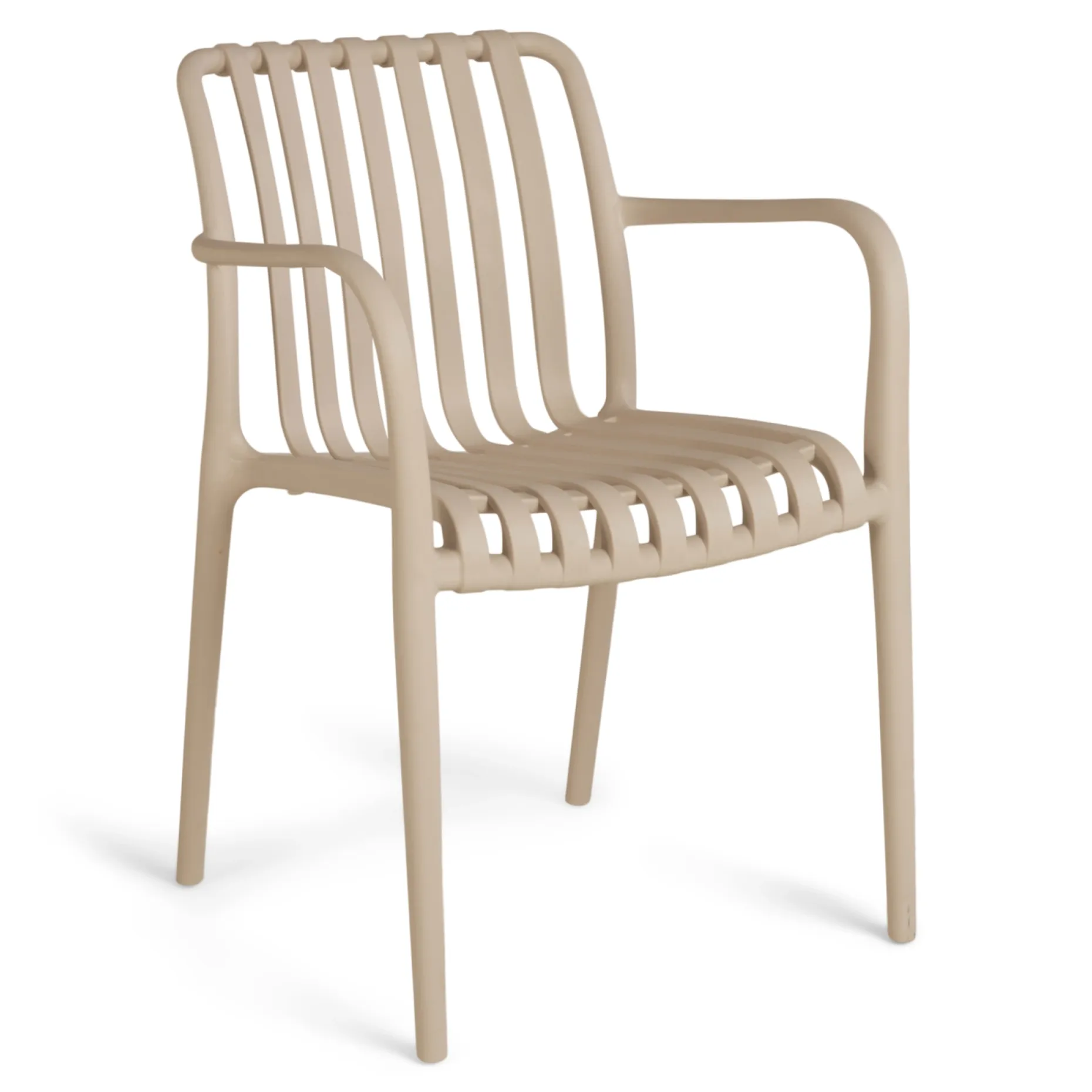 Stabelbar stol i plast med armlæn.
