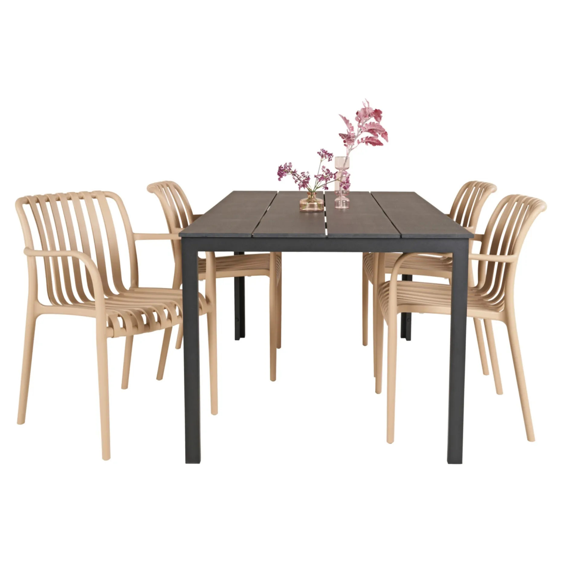 Hertil 4 stabelbare stole i sandgrå plast. Kan stables.