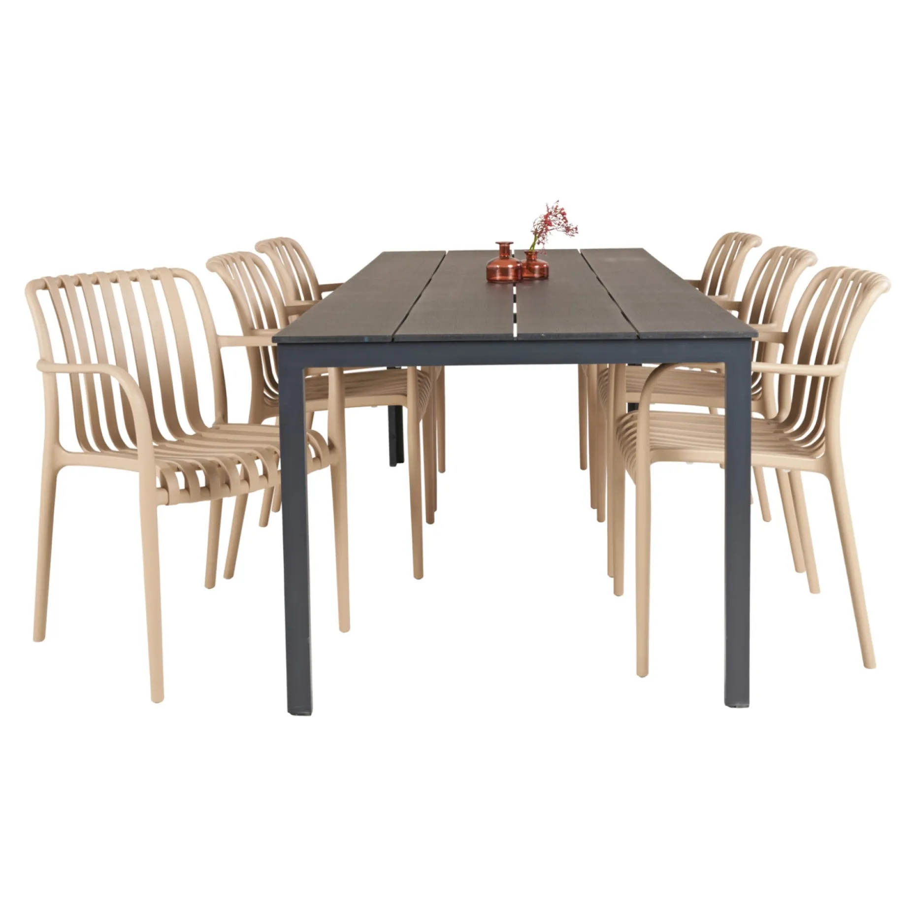 Hertil 6 stabelbare stole i sandgrå plast. Kan stables.