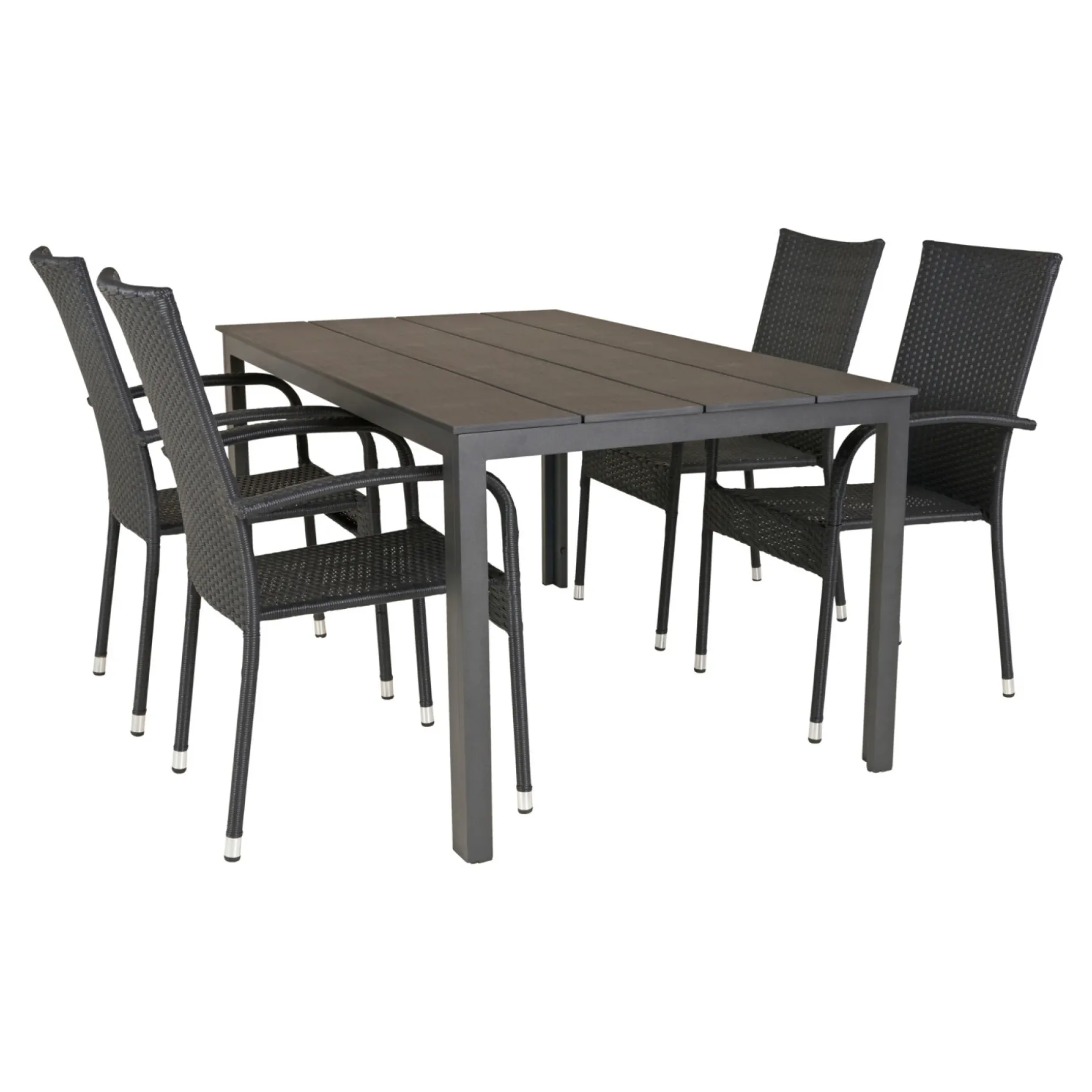 Pisa bord 90×150 cm med bordplade i sort nonwood og antracit alustel. Hertil 4 Napoli stabelbare stole i sort børstet PE-flet.