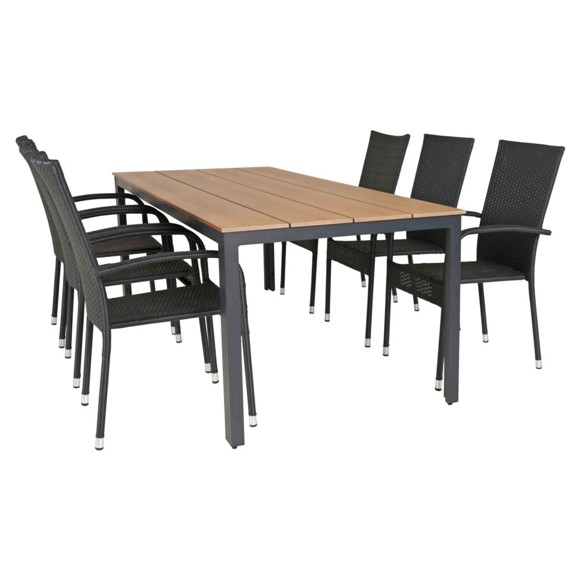 Havebord 90×205 cm med bordplade i teakfarvet nonwood og antracit alustel. Hertil 6 Napoli stabelbare stole i sort børstet PE-flet.