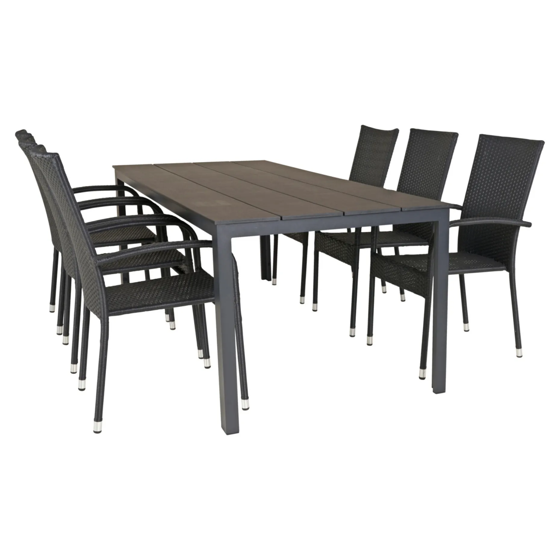 Pisa bord 90×205 cm med bordplade i sort nonwood og antracit alustel. Hertil 6 Napoli stabelbare stole i sort børstet PE-flet.