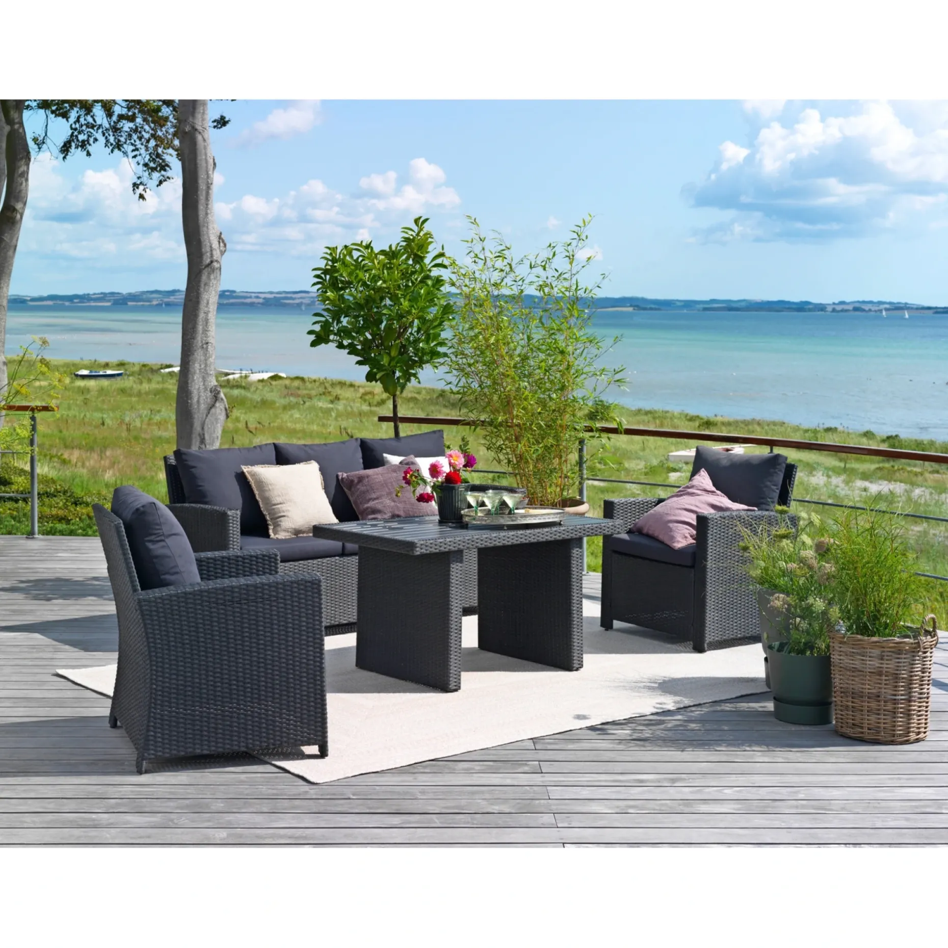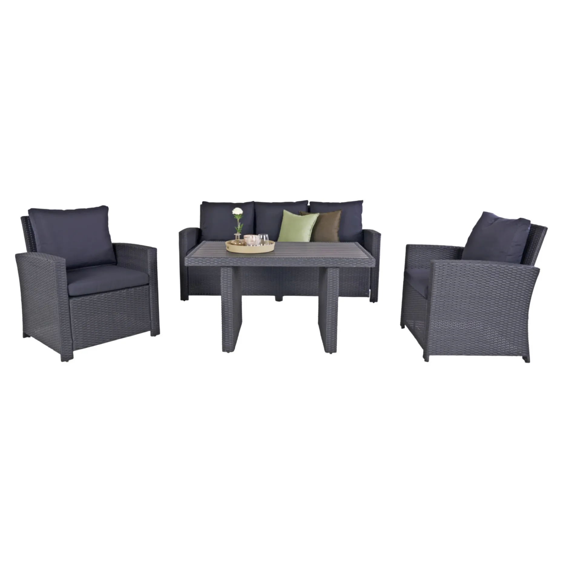 Elegant sofasæt i sort børstet PE-flet. Sofasættet består af en 3 personers sofa, to stole og et højt bord med nonwood top. Sofasættet har en lang udendørs levetid og kræver meget lidt pleje.