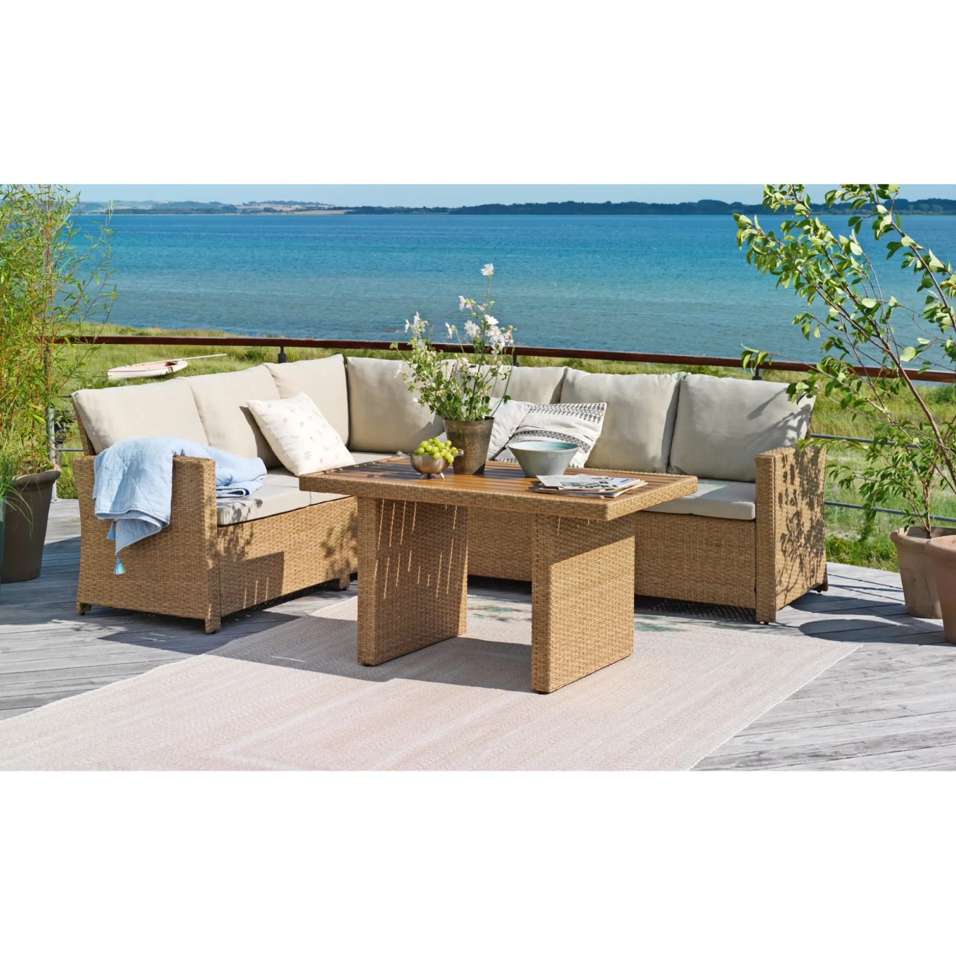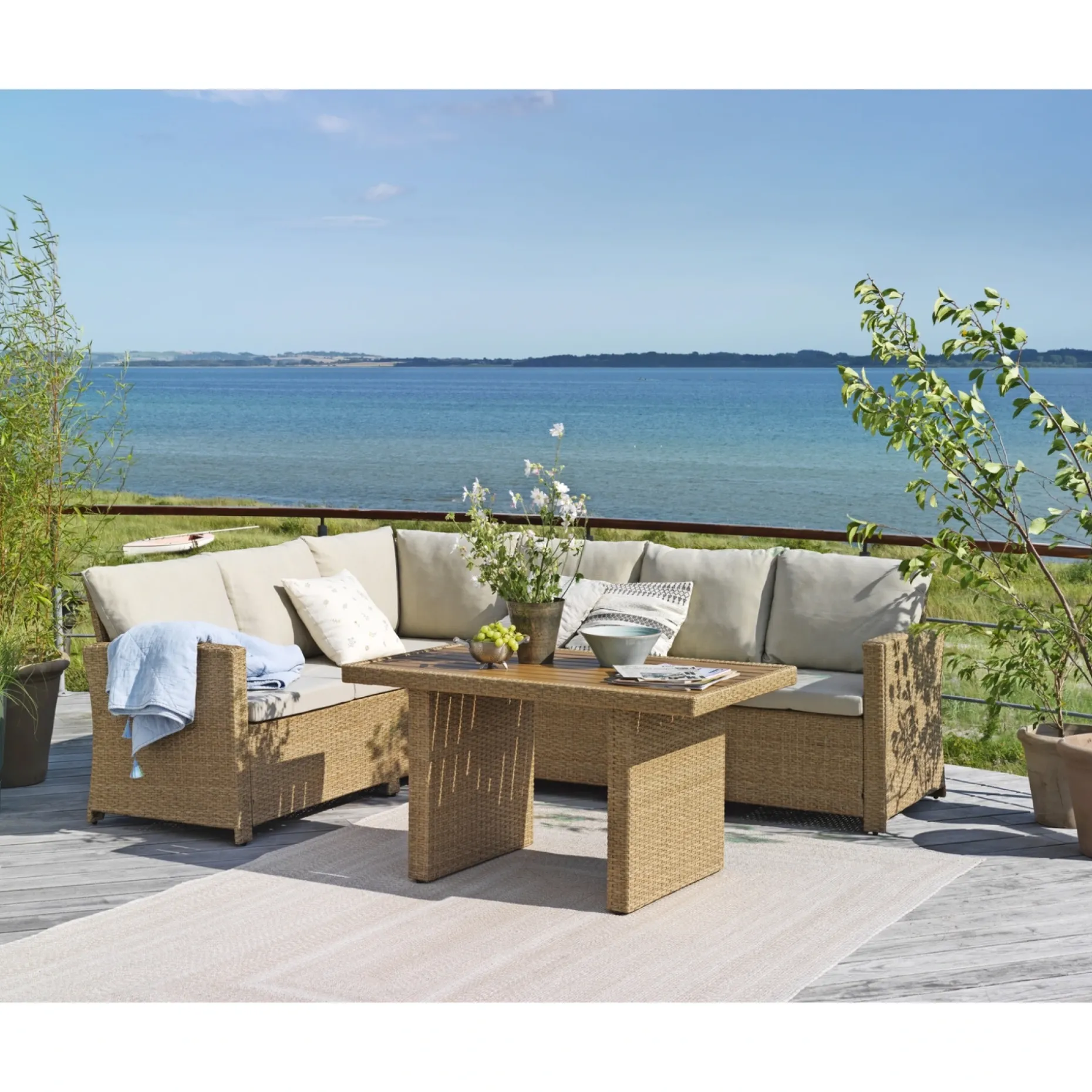 Med dette sæt kan du nærmest flytte stuen ud på terrassen eller i haven. Sættet består af en stor, rummelig hjørnesofa og et godt sofabord