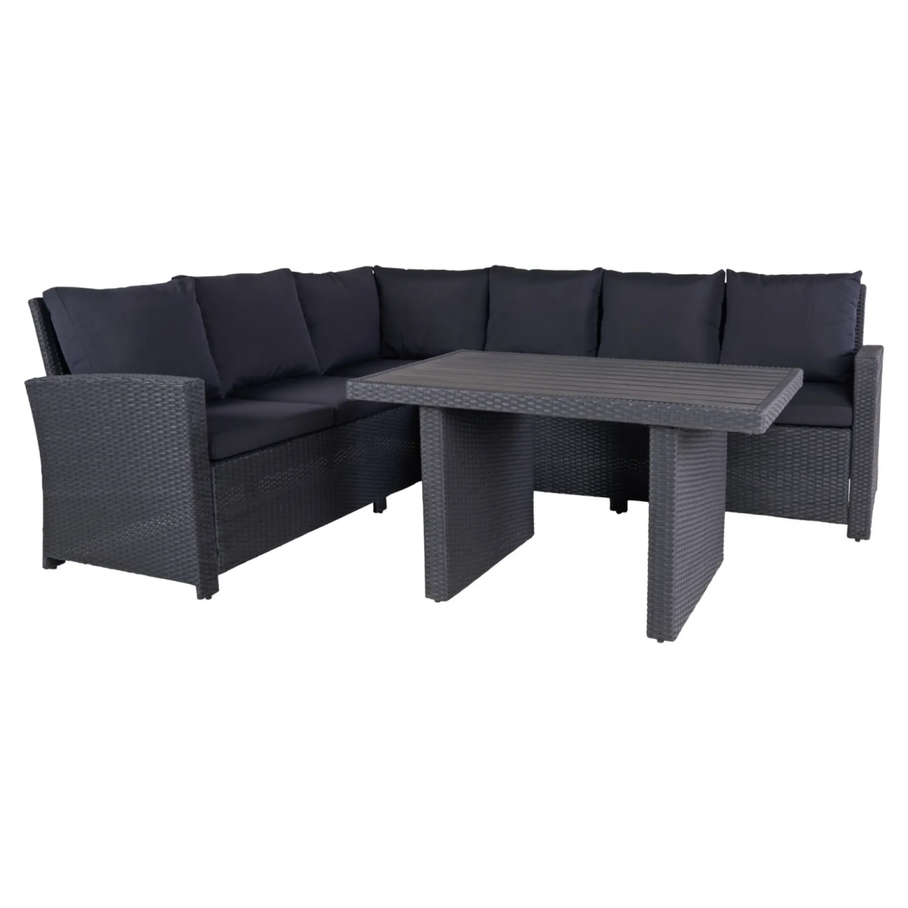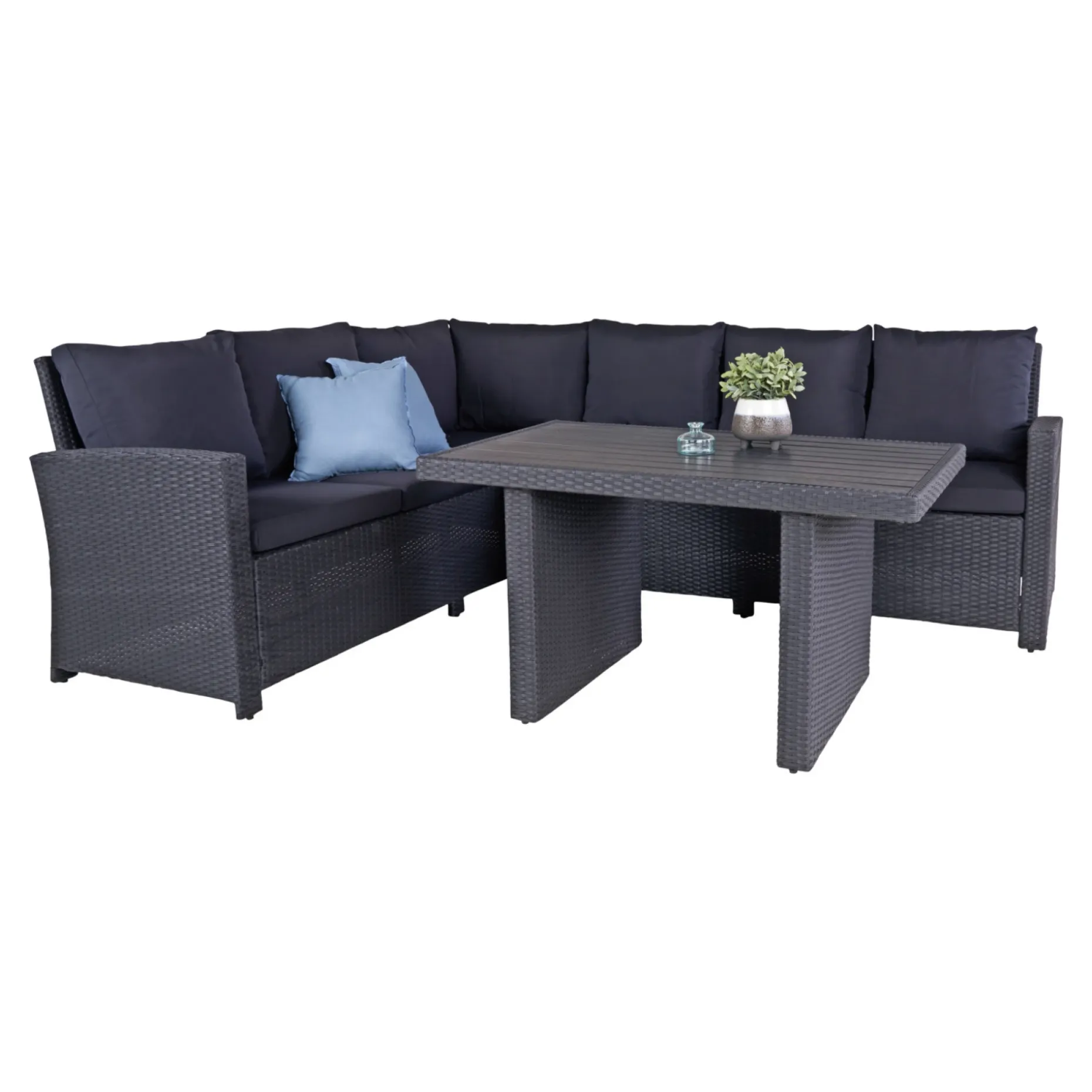 Med dette sæt kan du nærmest flytte stuen ud på terrassen eller i haven. Sættet består af en stor, rummelig hjørnesofa og et godt sofabord