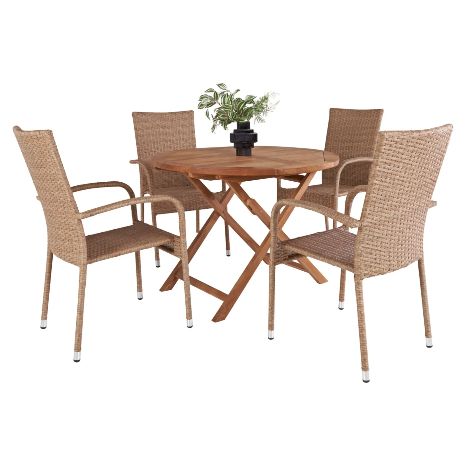 Bord Ø100 cm i teak. Kan foldes sammen. Hertil 4 Napoli stabelbare stole i naturfarvet PE-flet.