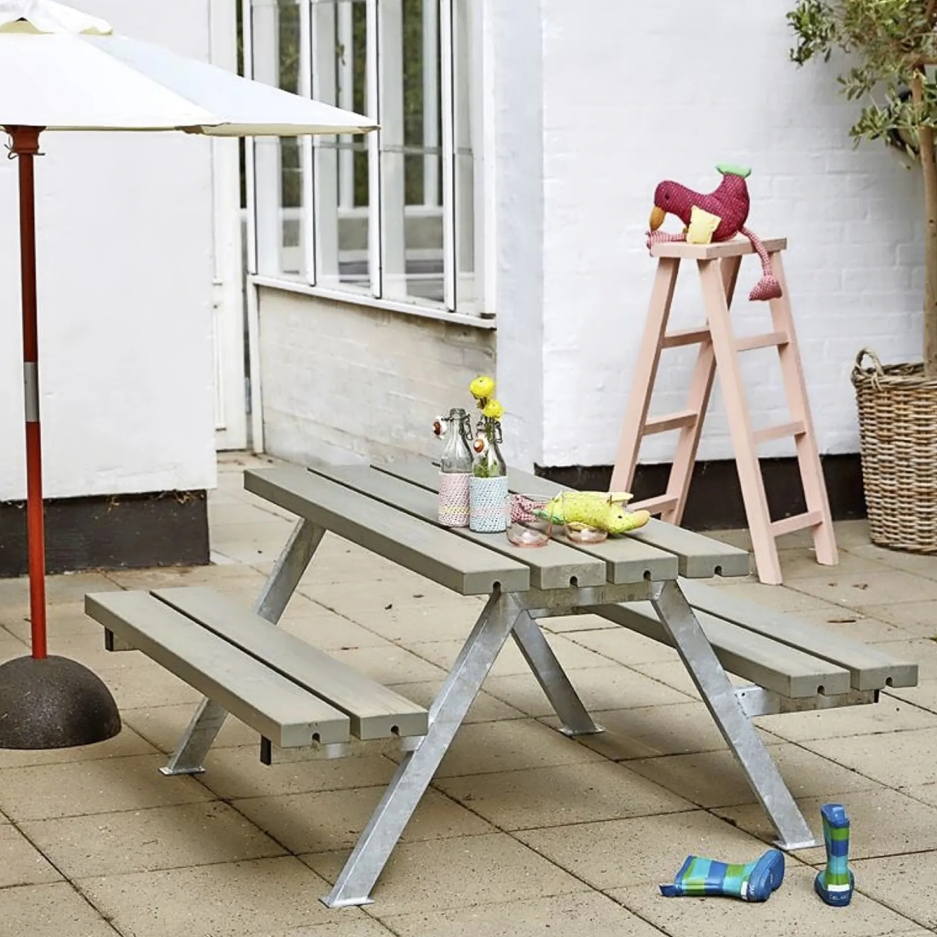 PLUS ALPHA BORDBÆNKESÆT GRÅBRUNAlpha Junior Bord/Bænkesæt – 177 cm – GråbrunPlanker:42×116 mm trykimprægneret og grundmalet gråbrunNærmeste RAL 7023 (transparent toning).Stel:Varmgalvaniseret stål 30×50 mm.Inkl. bolte og skruer.Bordplade:Længde 177 cm – bredde 50 cm – højde 57 cm.Bænke:Længde 177 cm – bredde 24,5 cm – højde 32,5 cm.Siddepladser: 10 (5 pr. bænk).Leveres som “Saml selv”.Trykimprægneret og grundmalet