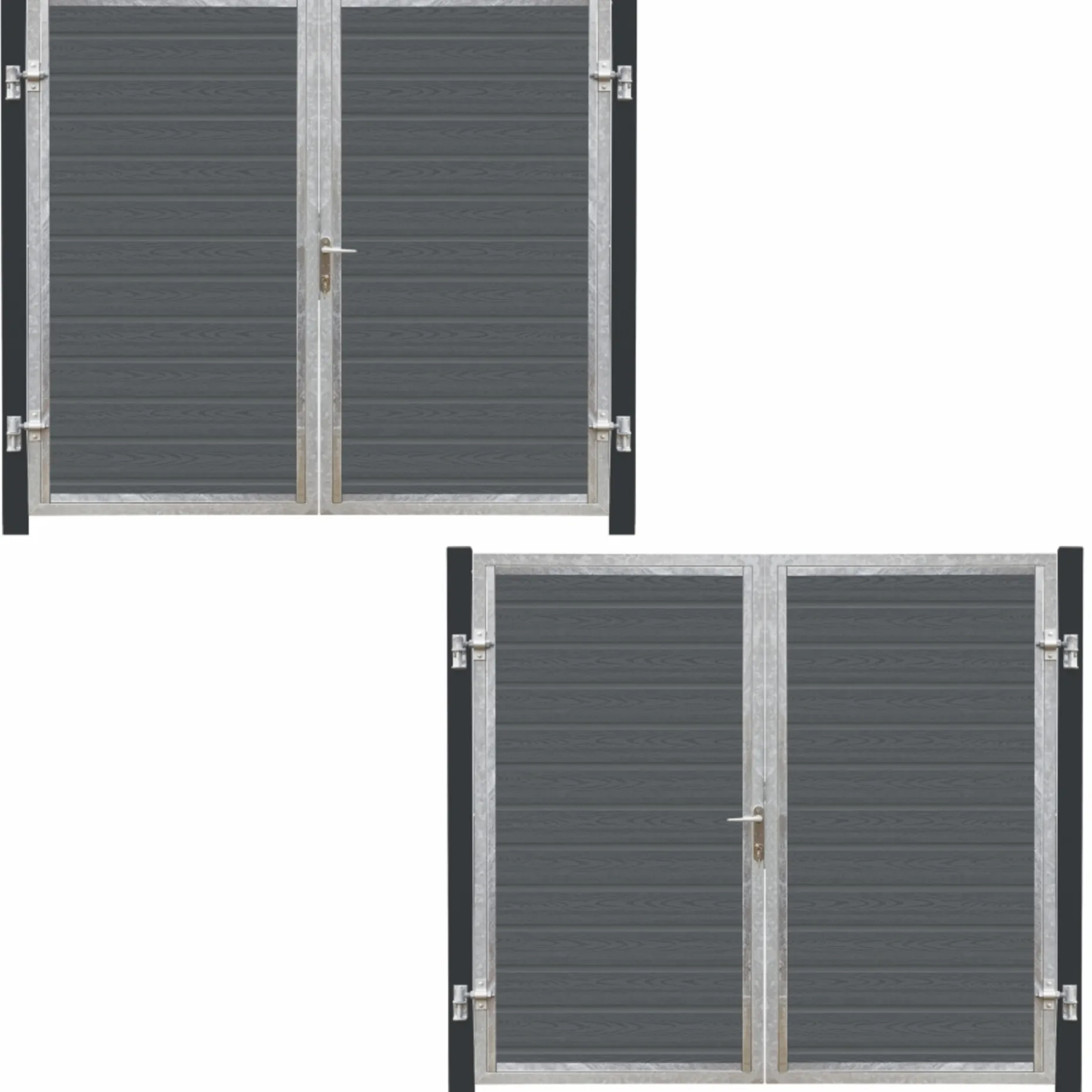 Artura komposit dobbeltlåge 213×175 cm med gråsorte stolper til nedstøbning. Lågen består af skifergrå profilbrædder med træstruktur, som skaber en flot og spændende overflade.