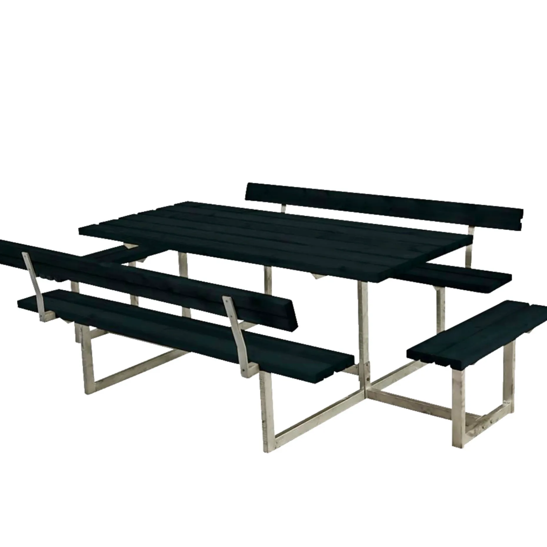 PLUS BASIC BORDBÆNKESÆT SORTBasic Bord/Bænkesæt m/2 ryglæn og 2 påbygninger – 260 cm – SortVarenr. består af:1 stk. bord/bænksæt, 2 stk. ryglæn inkl. beslag og 2 stk. påbygninger.Planker:42×116 mm nåletræ.Fungicidbehandlet og grundmalet sort.Nærmeste RAL 9005 – vandbaseret. Varenr. 19816-15.Bordplade:Længde 177 cm – bredde 78 cm – højde 73 cm.Bænke:Længde 177 cm – bredde 25 cm – højde 45 cm.Ryghøjde 75 cm.Siddepladser: 8 (3 pr. bænk + 1 pr. påbygning).Stel/ben:30×50 mm varmgalvaniseret stål.Leveres som “Saml selv”.Fungicidbehandlet og grundmalet