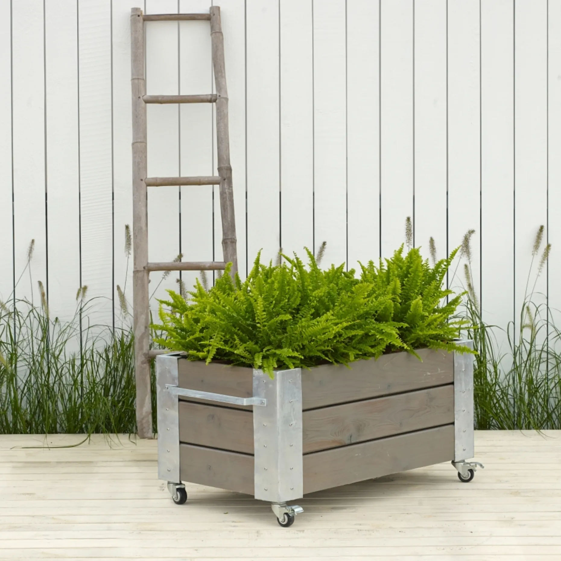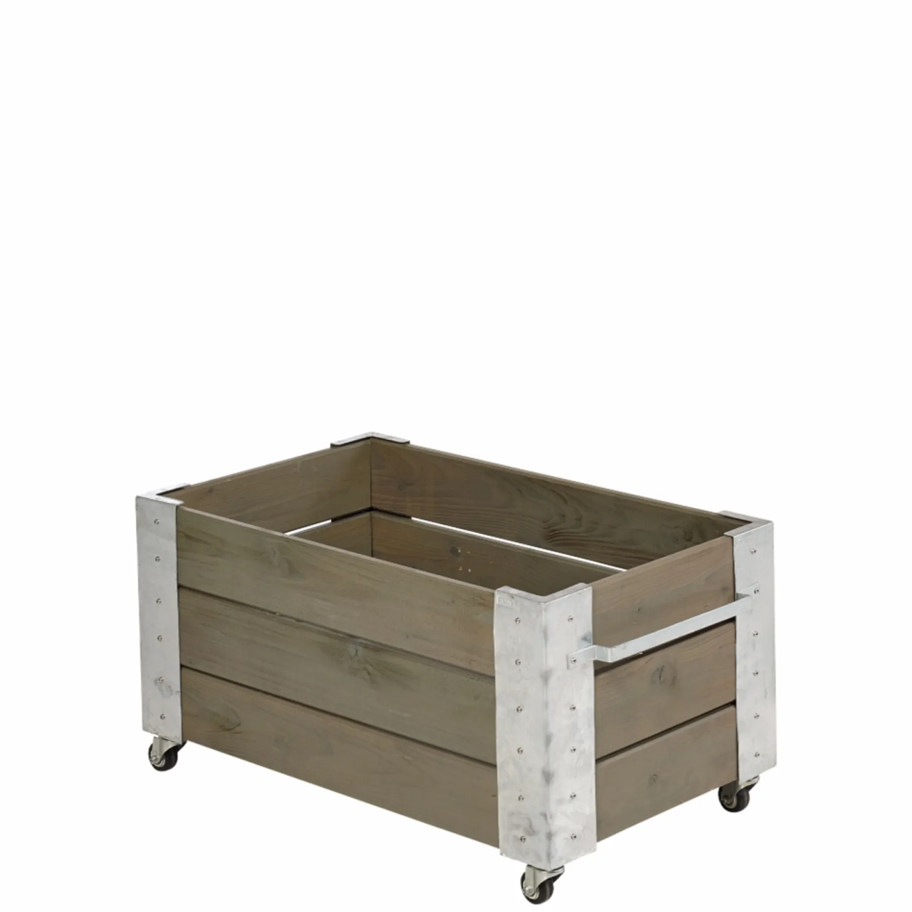 Cubic Blomsterkasse med hjul i gråbrun finish, egnet til terrasse og have.Planker på 20×120 mm i nåletræ er trykimprægneret og grundmalet i en gråbrun tone (nærmeste RAL 7023, vandbaseret). Den trykimprægnerede træoverflade bidrager til langvarig holdbarhed ved udendørs brug.Varmgalvaniserede Cubic-hjørner med to håndtag og bolte sikrer stabilitet og nem montering. Kassen leveres som “Saml selv” og indeholder en justérbar bund samt Fibertex dug, der skal tilpasses ved montering. Fire hjul Ø50 mm gør kassen mobil; to hjul har bremselås.Passer til Maxikap Kapillærvandingskasse fra Pindstrup, hvilket giver mulighed for lettere vanding og stabil vækst i plantekassen.