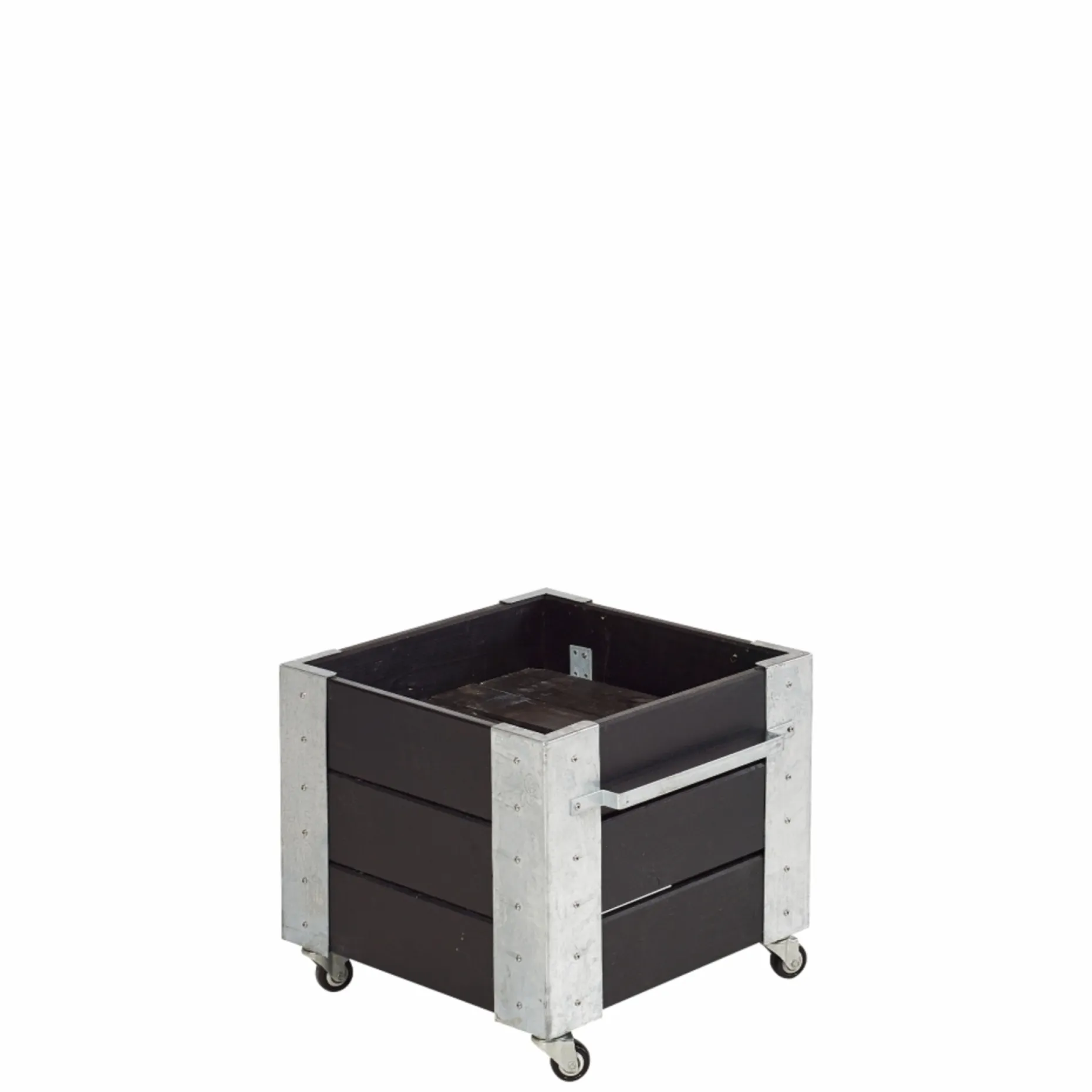 PLUS Cubic blomsterkasse er udført i 20×120 mm nåletræsplanker, trykimprægneret og grundmalet sort (nærmeste RAL 9005, vandbaseret).