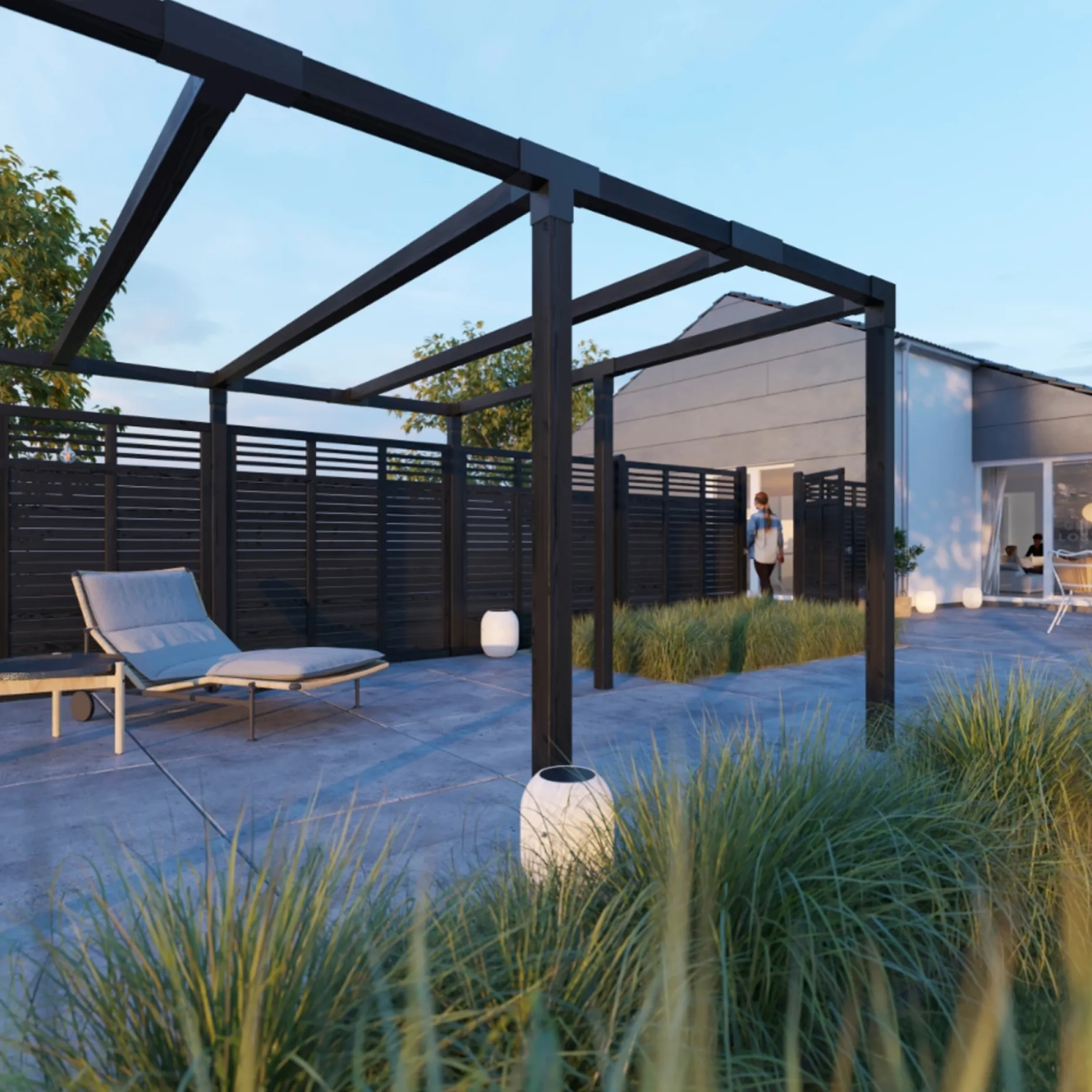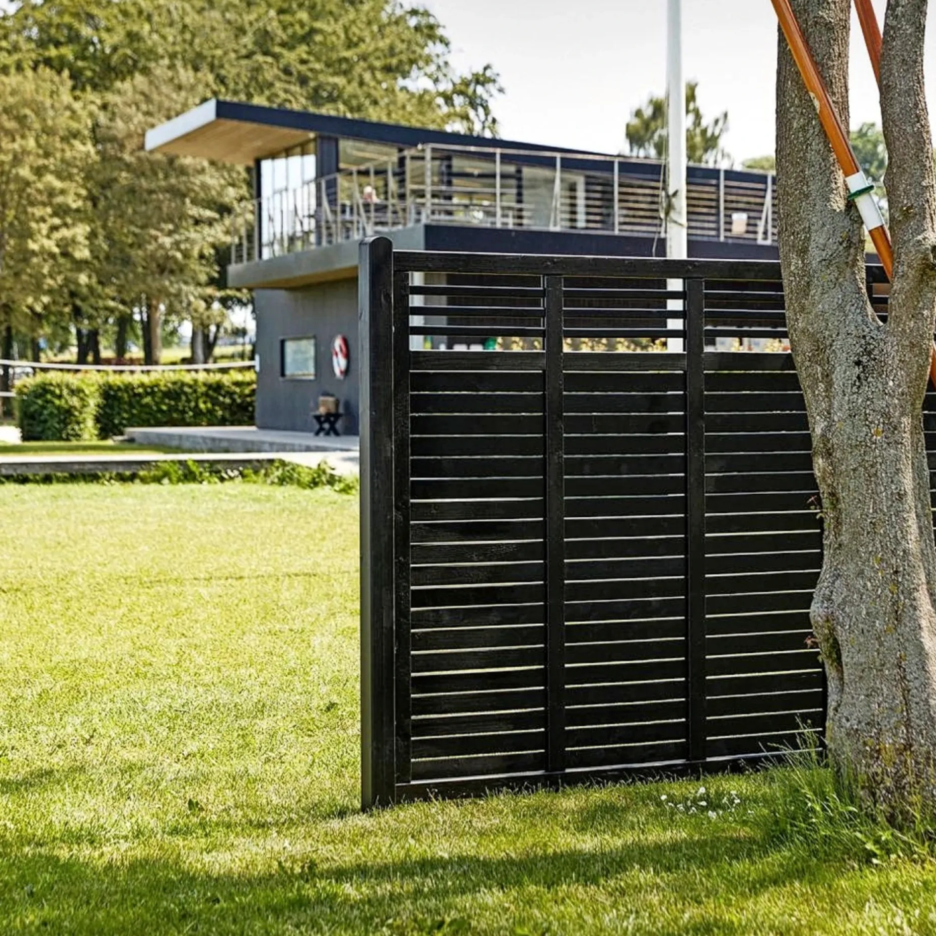 Designet gør det muligt at kombinere skrå og vandrette hegnselementer samt låger, så du kan skabe harmoniske løsninger, der passer til omgivelser og landskab. Sandwich-bundrammen og de solide rammer sikrer stabilitet, og samling med rustfrie slagskruer giver en robust konstruktion til udendørs brug.