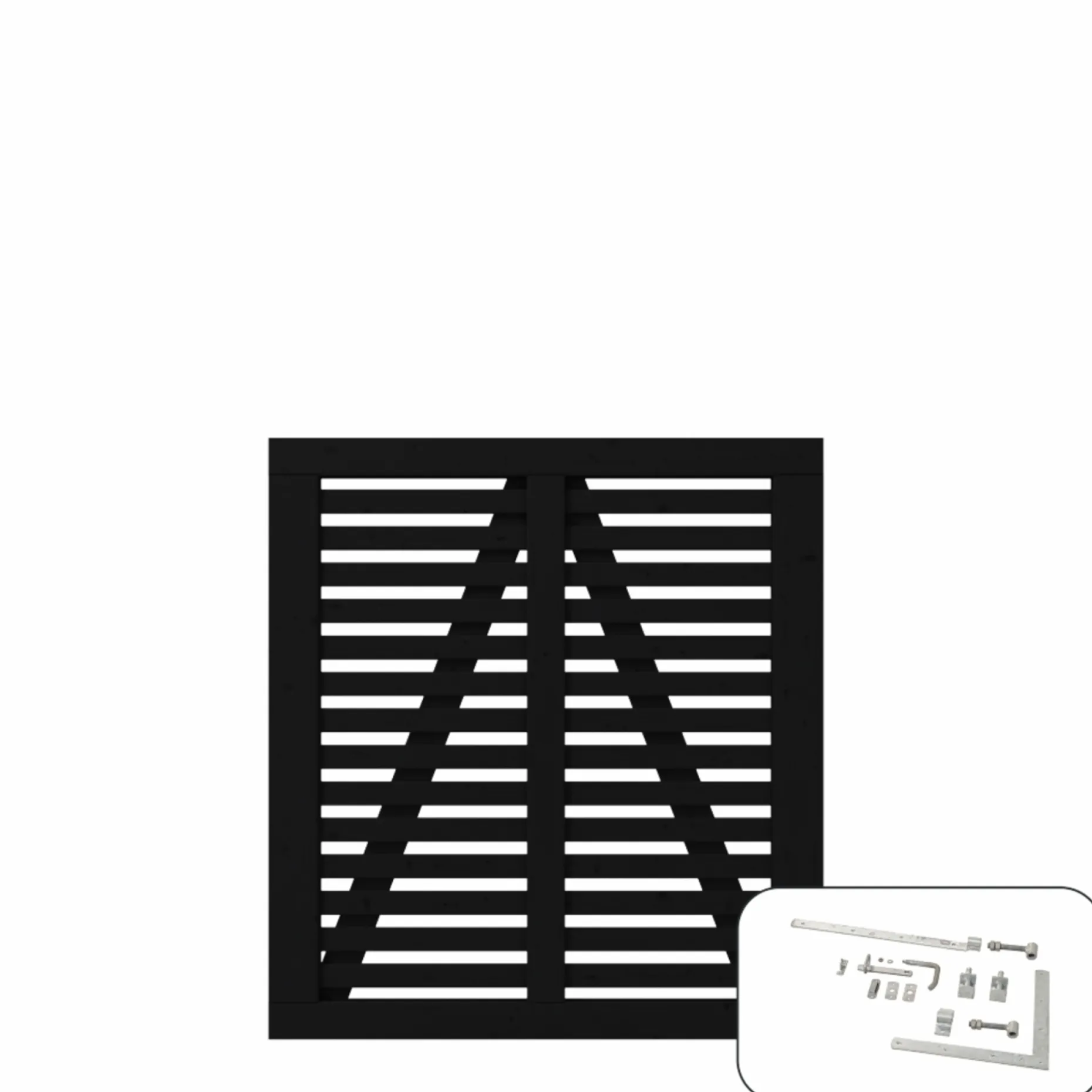 Harmoni Enkeltlåge inkl. beslag – 100×107 cm. Lad harmonien brede sig i dit uderum med denne smukke havelåge i træ. Fungicidbehandlet og grundmalet sort.