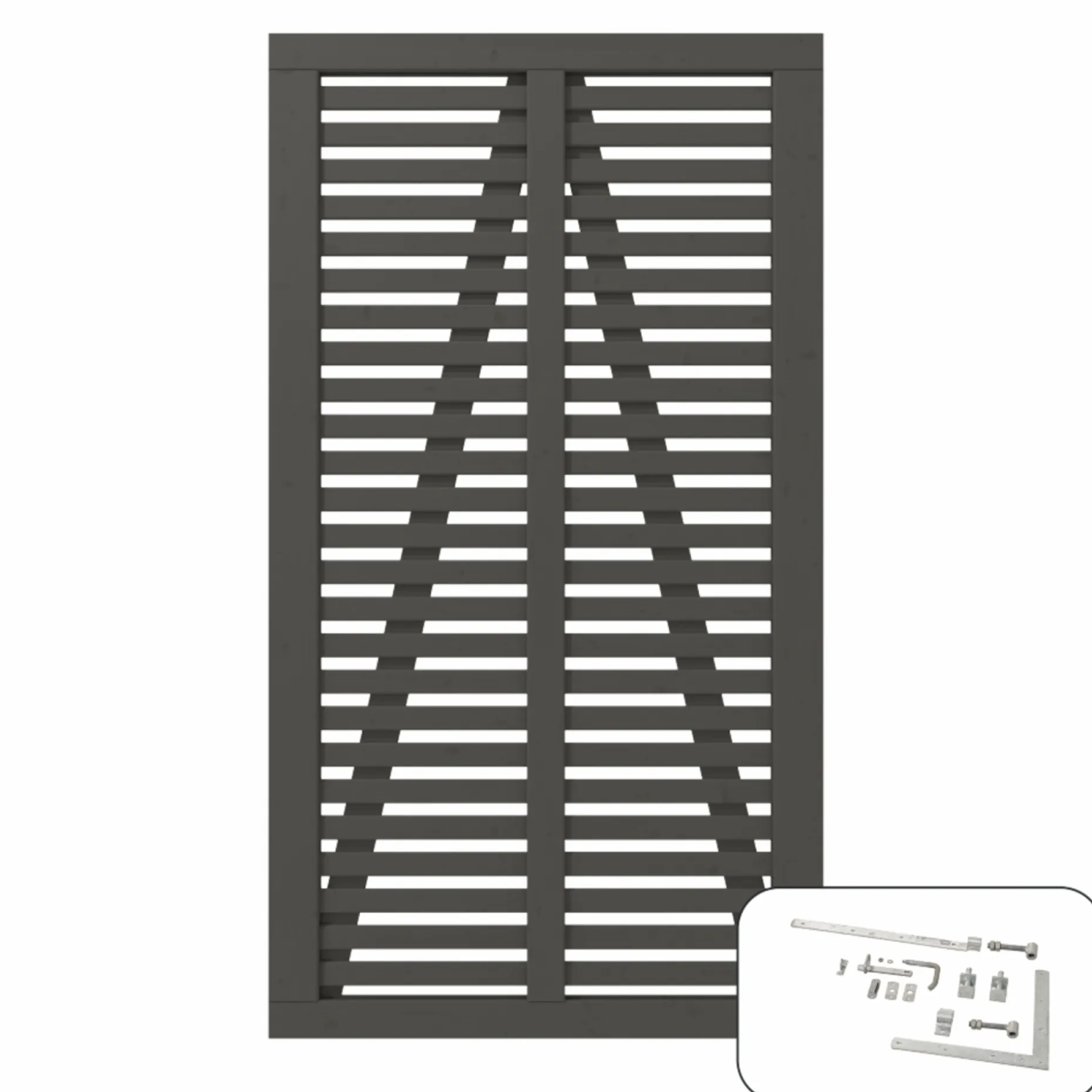 Denne havelåge i træ, harmonidesignet, leveres inkl. beslag og måler 100 x 180 cm.