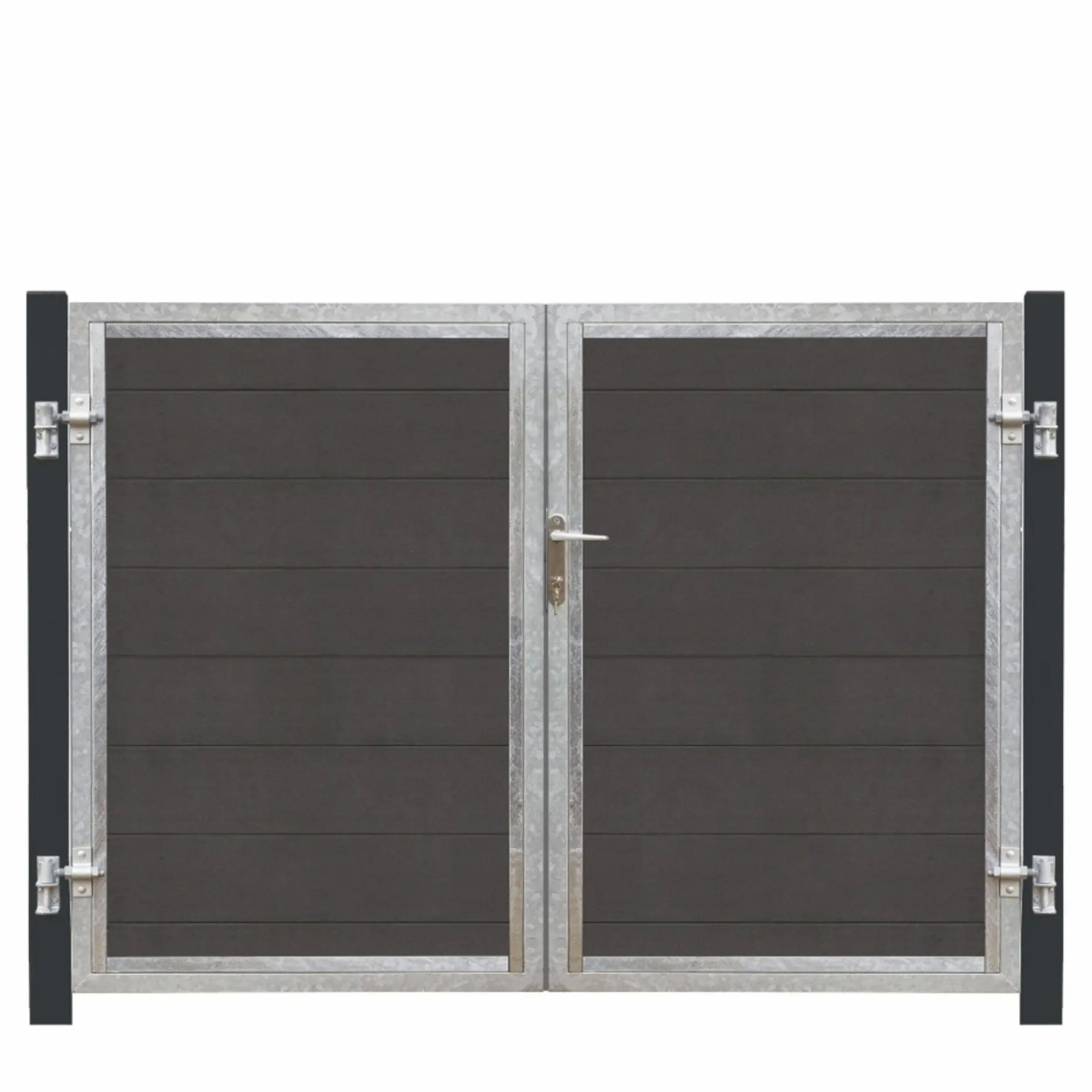 Futura Dobbeltlåge HI 197×145 cm + 16 cm gråsorte stålstolper. Komplet dobbeltlåge leveres færdigsamlet og indeholder planker, stålstolper til nedstøbning, beslag og rustfri låsekasse med tilbehør. Nem montering sikres, da lågen leveres færdigsamlet og stålstolperne er beregnet til nedstøbning; justérbare stabler og medfølgende bolte gør finjustering mulig.