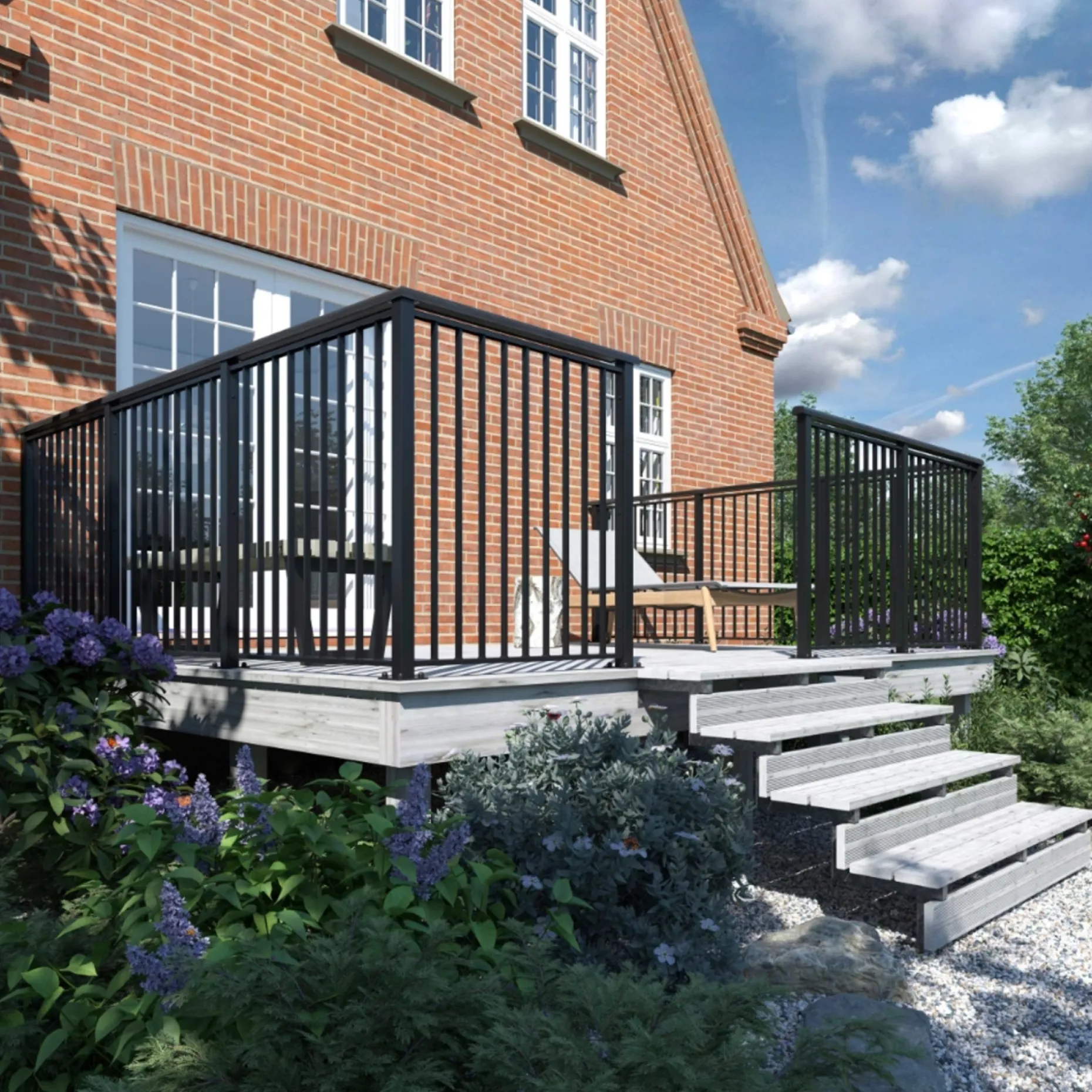 PLUS Basic Gelændersystem er et hegn i varmgalvaniseret stål, pulverlakeret i sort, designet til at skærme og lukke af på eksempelvis høj terrasse eller balkon. Mål 90 x 98 cm giver en kompakt løsning til både funktion og æstetik. Det matte, rå stål-look i kombination med det naturlige materiale mahogni skaber et eksklusivt og tidløst udtryk, der passer ind i enhver haveindretning. Varmgalvaniseringen gør hegnet mindre modtageligt for korrosion og gør det let at vedligeholde, mens pulverlakeringen i RAL9005 glans30 sikrer en ensartet, sort overflade.Det matte, rå stål-look kombineret med mahogni giver en vis kontrast, hvor stållets industrielle udtryk balanceres af træets varme toner. Resultatet er et eksklusivt, tidløst hegn, der kan indgå i både moderne og klassiske haver.PLUS Basic Gelændersystem leveres pulverlakeret i RAL9005 glans30, hvilket bevarer et stilrent udtryk i haveindretningen og på terrassen. Overfladen er udført for at give en ensartet finish og langvarigt visuelt indtryk.Systemet er nemt at vedligeholde takket være varmgalvaniseringen, hvilket reducerer behovet for hyppig behandling. Målene 90 x 98 cm gør det velegnet til standardfelter på terrasser og altaner.