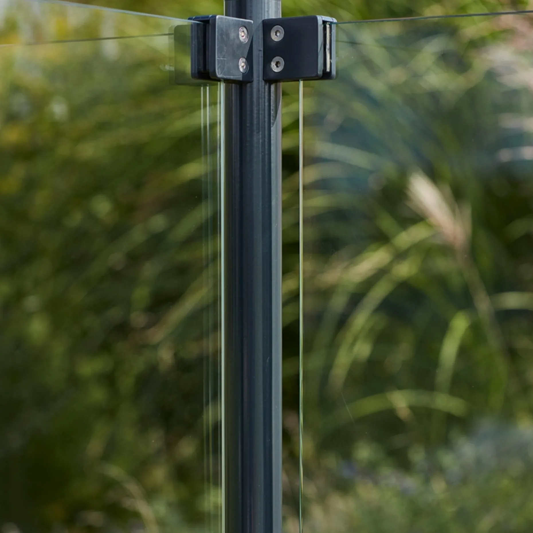 Glaselementet er 8,76 mm hærdet lamineret glas bestående af to glaslag limet sammen om en folie, så glassplinter hæfter i folien ved brud. Glasset leveres inkl. glasbeslag og skruer, så det er klar til montage mod runde stolper.