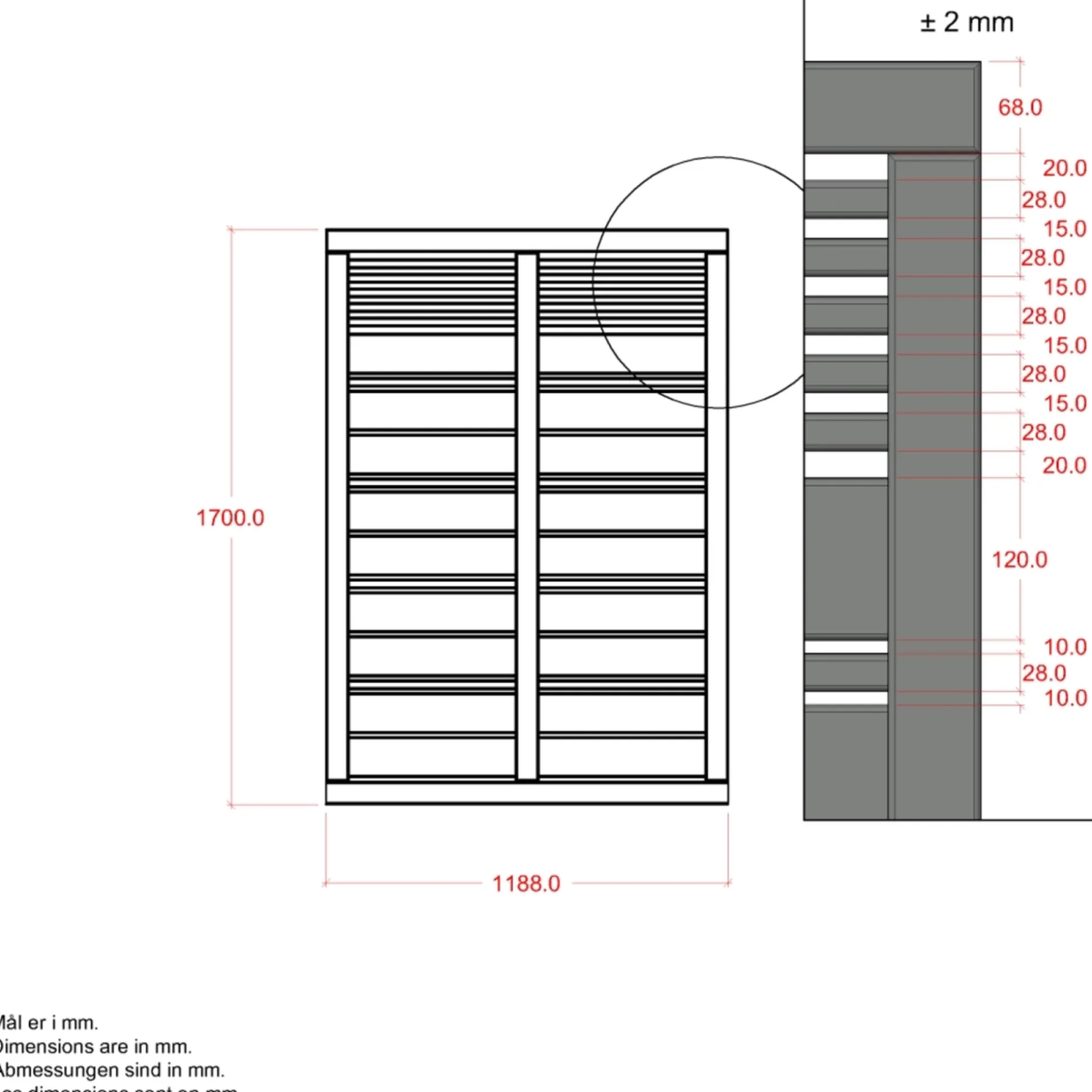 PLUS Silence Hegn er fungicidbehandlet og grundmalet i umbragrå og leveres i størrelsen 120 x 170 cm. Designet er inspireret af aftegningerne på de klassiske vinduesskodder og skaber et tæt, moderne udtryk.
