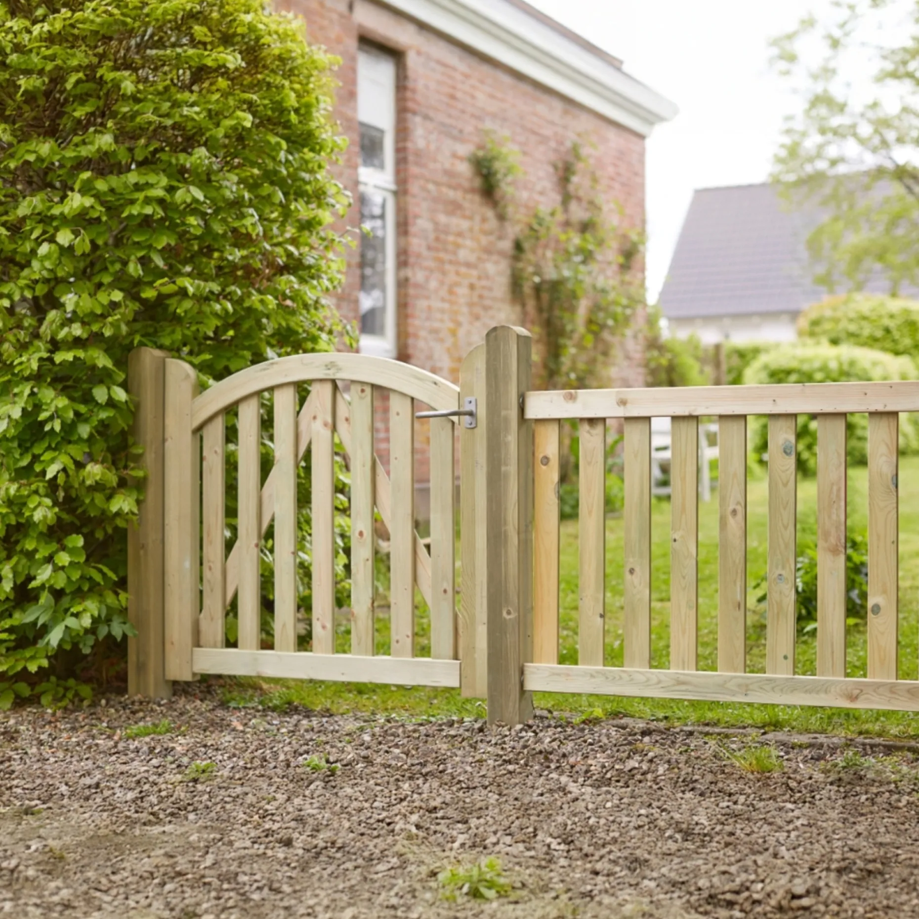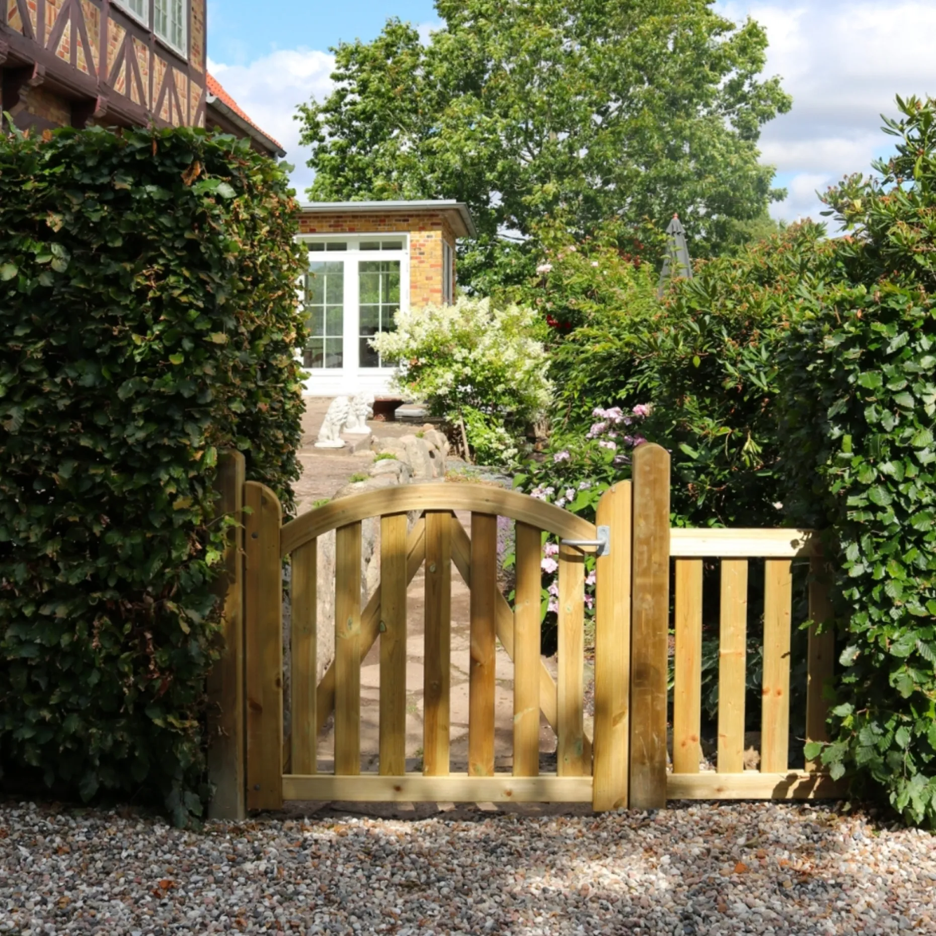 Inkluderede beslag sikrer, at lågen kan indgå direkte som del af et færdigt hegnsforløb.
