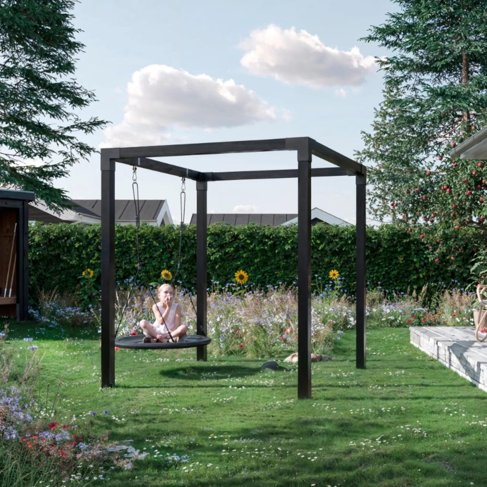 Gyngestativ med redegynge, som nemt kan tilpasses, når børnene bliver for store til at bruge gyngen. Stativet kan forvandles til et tørrestativ eller en pergola, så du får flere anvendelsesmuligheder i haven.Daylife serien er designet som en hyldest til dagligdagen og livet med alt, hvad det indebærer. Med Daylife er det nemt at skabe et skønt uderum, som kan bruges til hverdagens mange gøremål gennem hele livet og tilpasses i takt med livets behov ændres.Daylife leveres i overskuelige samlesæt, så det er nemt og hurtigt for dig at bygge dit nye uderum.Det fleksible design betyder, at gyngestativet kan følge ændrede behov over tid og skifte funktion efter brug.Daylife gør det muligt at indrette et praktisk og indbydende uderum. Seriens udtryk og funktionalitet tilpasses daglige behov og skiftende anvendelse. Det fleksible valg af funktioner giver dig flere muligheder i hverdagen. Samlesættene leveres overskueligt og gør opbygningen enkel for brugeren.