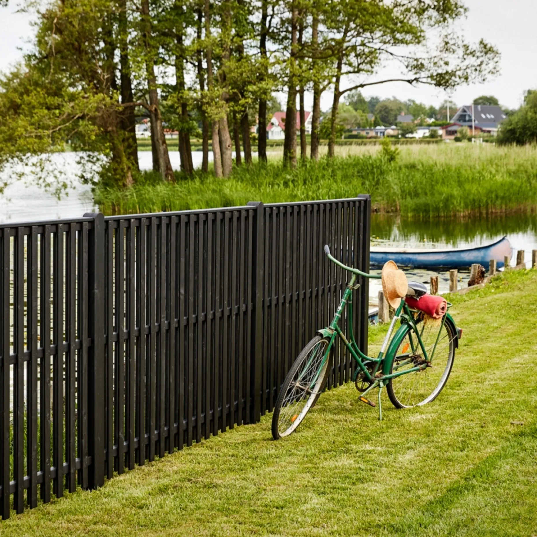 Hegnet er fungicidbehandlet og grundmalet sort, hvilket giver en dæmpet og ensartet overflade.