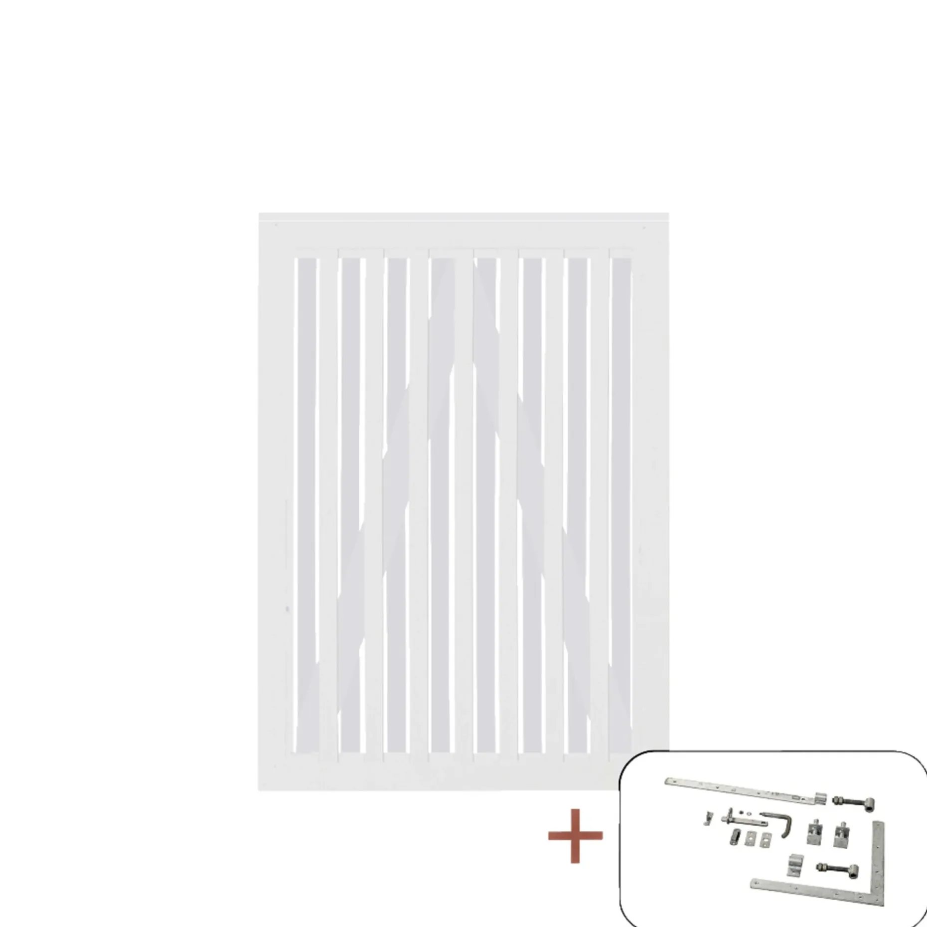 Nagano enkeltlåge inkl. beslag – 100×140 cm. Nagano er en japansk inspireret hegnsserie bygget op af smalle, lodrette lister, som skaber en flot 3D-effekt og struktur i hegnets overflade. De forskudte lister gør hegnet mere tæt end fx Sendai-serien, så du får privatliv, men stadig kan ane omgivelserne på den anden side. Lågen er fungicidbehandlet og grundmalet 2 gange i hvid, hvilket giver overfladen en ensartet finish ved levering. Produktet leveres med beslag og hvid overflade som nævnt, og formatet er 4,4 x 100 x 140 cm.