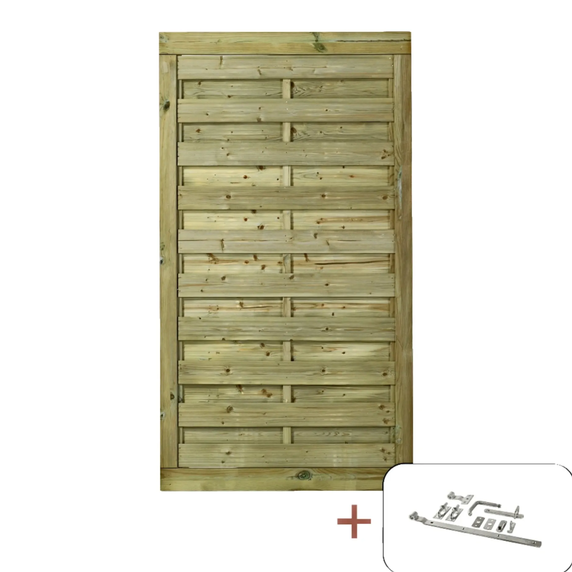 Overfladen i natur trykimprægneret træ fremhæver træets struktur og giver et naturligt udtryk, der harmonerer med terrasser og haver. Lågens medfølgende beslag er en del af leveringen.
