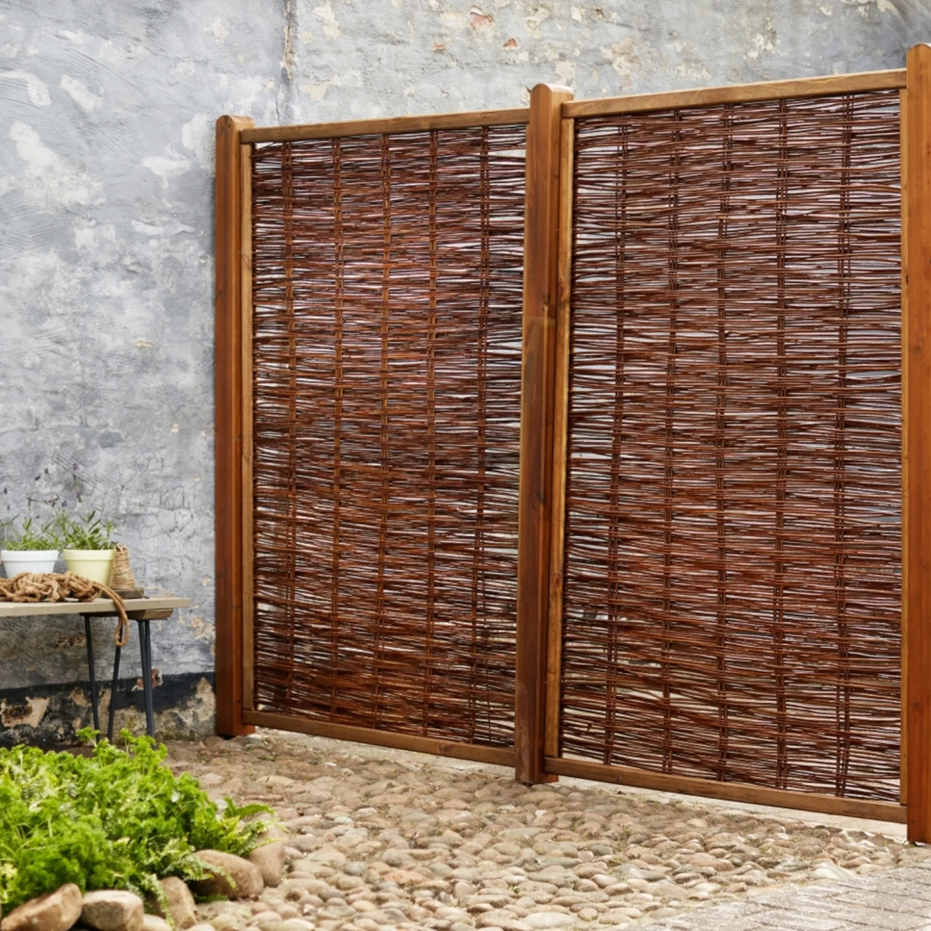 Det naturlige udtryk gør hegnet velegnet til gør-det-selv-projekter, hvor du ønsker et hurtigt og dekorativt resultat. Brug det som afskærmning mellem haverum, omkring blomsterbede eller som en varm baggrund ved terrassen.