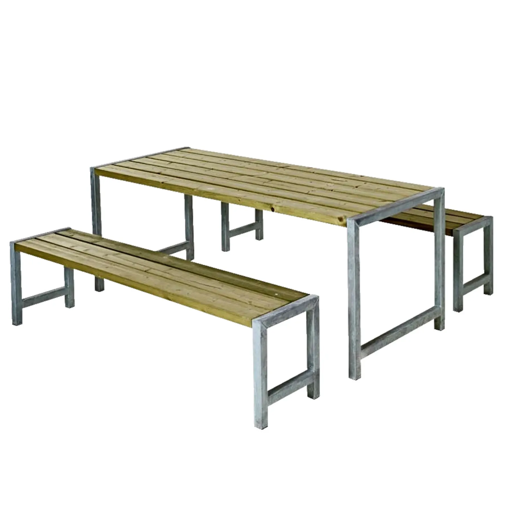PLUS PLANKESÆT NATURPlankesæt – 186 cm – TrykimprægneretVarenr. består af: 1 stk. bord og 2 stk. bænke.Inkl. justérbare stillesko.Planker:42×116 mm trykimprægneret nåletræ.Bord:Længde 186 cm – bredde 77 cm – højde 73 cm.Bænke:Længde 176 cm – bredde 38 cm – højde 45 cm.Siddepladser: 6 (3 pr. bænk).Stel/ben: 45×45 mm varmgalvaniseret stål.Justérbare stillesko (0-15 mm).Leveres som “Saml selv”.Tages møblerne ind om vinteren, passer bænken perfekt under bordet.Der er nemlig en smule forskel i bord- og bænkeplankernes længde, og det sparer plads i redskabsskur eller garage, så andre ting og sager også kan få husly i den kolde tid.Trykimprægneret klasse A/B