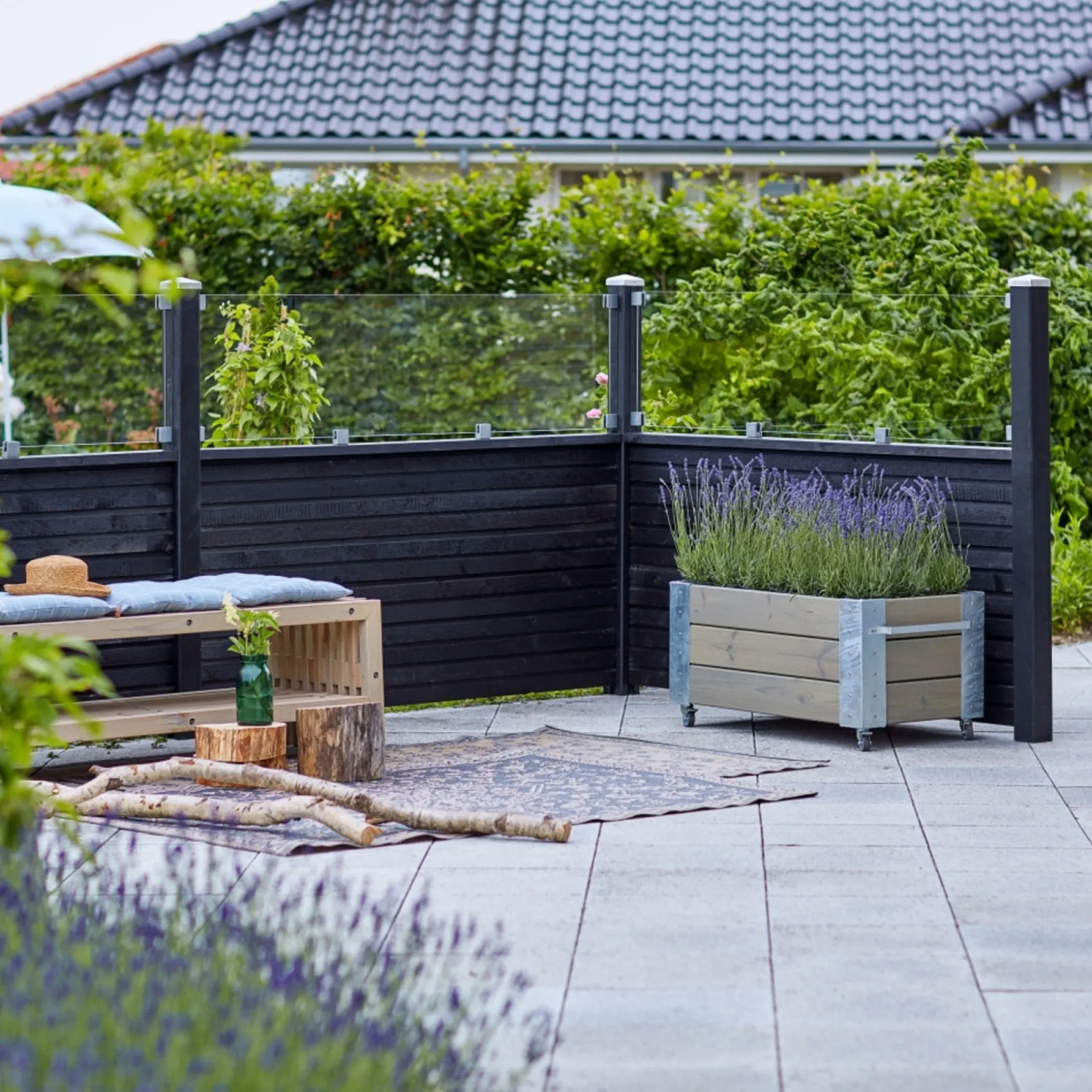 Ved at variere højde på sektionerne kan du styre både privathed og læ nemt. Anvend høje sektioner mod vind og lave sektioner ved siddeområder for at få balance mellem afskærmning og udsyn.