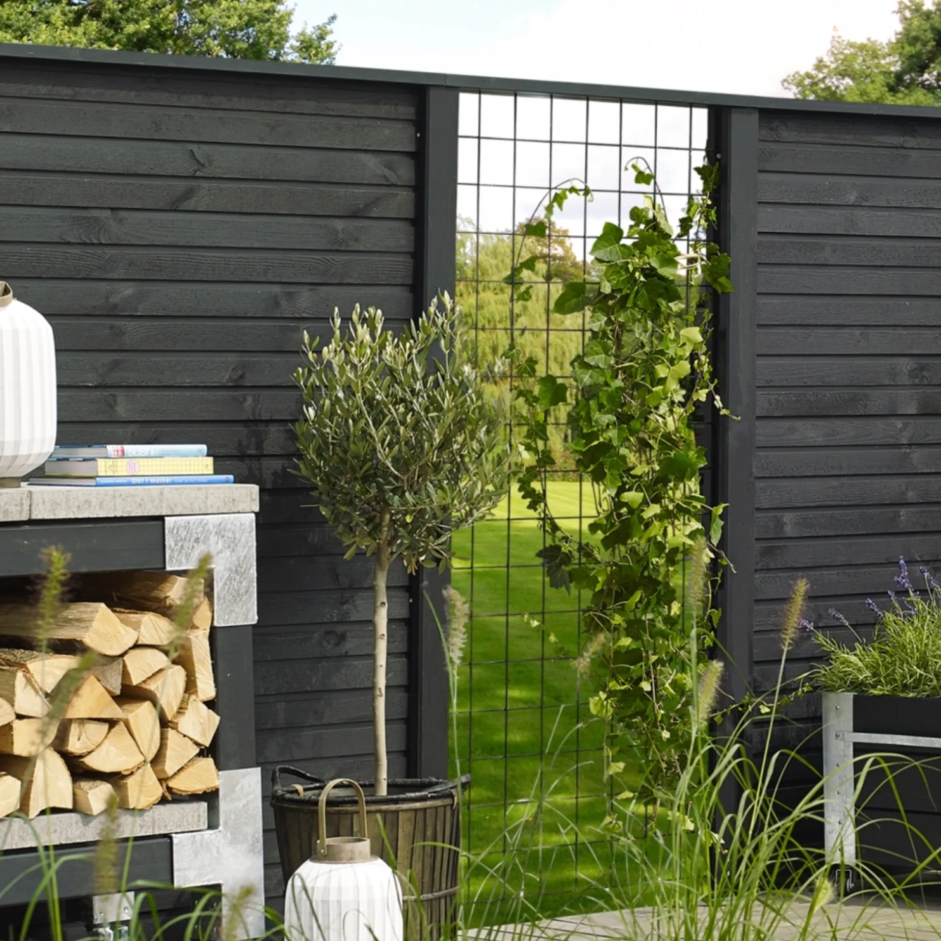 Det massive plankedesign sikrer tæt afskærmning og et visuelt kontinuerligt forløb, som skaber et sammenhængende indtryk langs hækken eller terrassen. Den sorte, grundmalede overflade giver en ensartet finish ved leveringen.