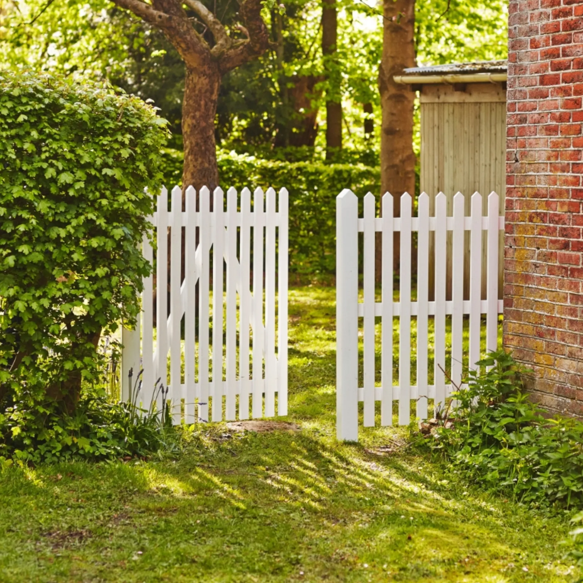 Med sine tydeligt definerede lameller danner lågen rammen om indkørsler, indgange og små haverum, hvor både funktion og stemning er vigtig. Den hvide overflade skaber en lys kontrast i beplantningen og bidrager til et tidløst udtryk.