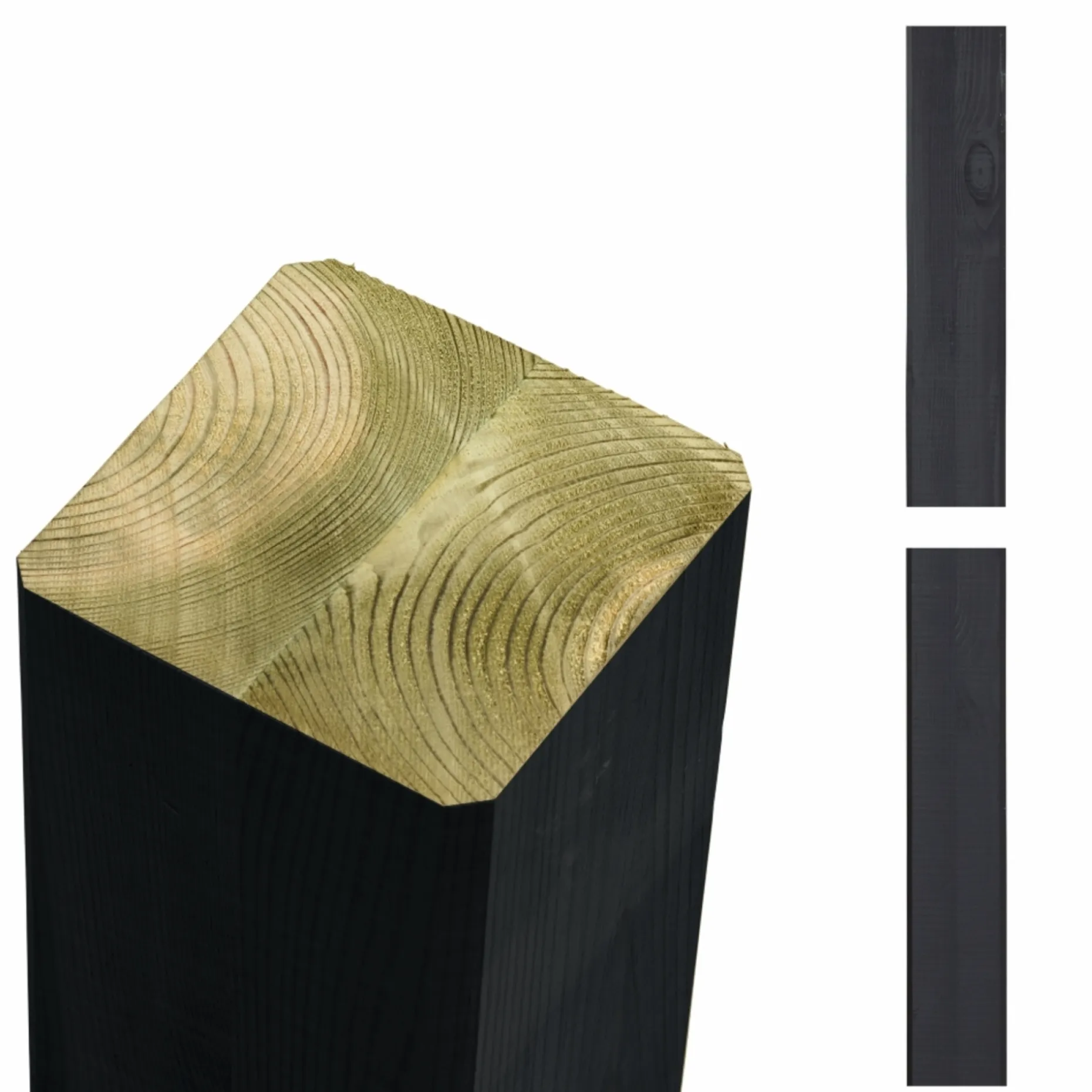 Omlimet stolpe/drager i fyrretræ, trykimprægneret NTR klasse A og grundmalet i farven Sort RAL 9005. Stolpen er sammenlimet af to stykker træ for at mindske revnedannelser og vridning samt sikre styrke og formstabilitet.
