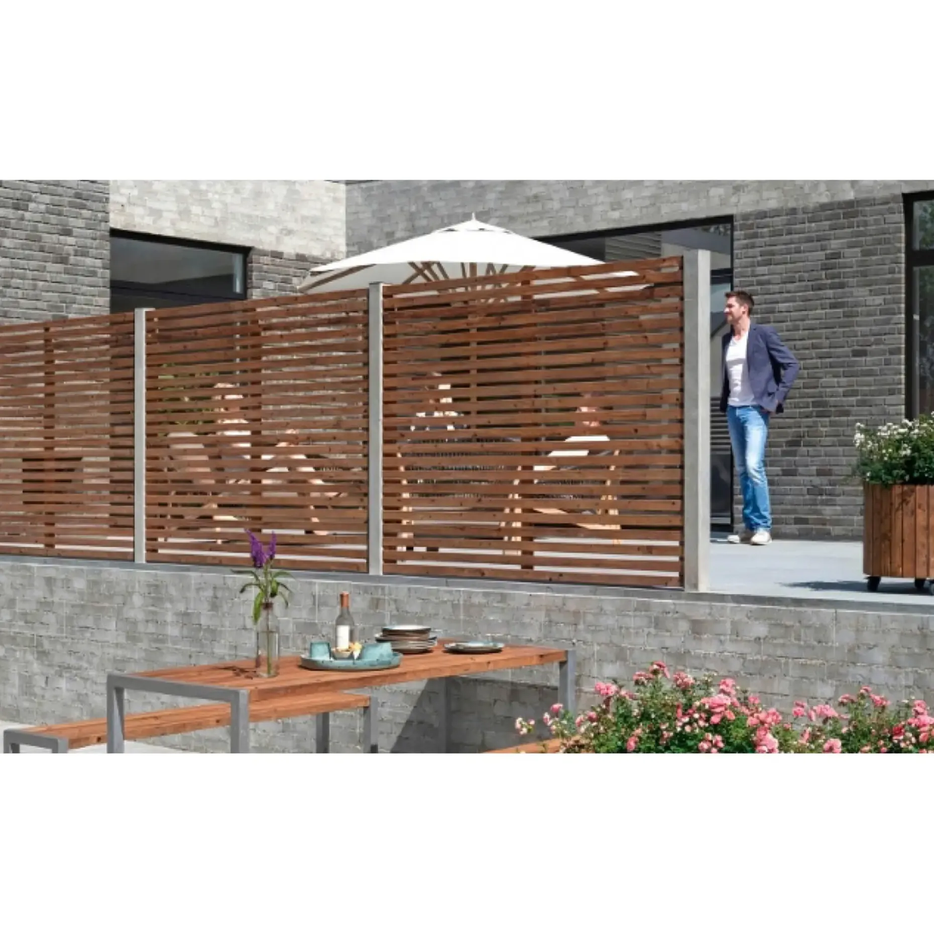 De smalle lameller på langs virker kamouflerende, så du kun aner omgivelserne, mens lyset filtreres og skaber smukke skygger og lysspil på terrassen.