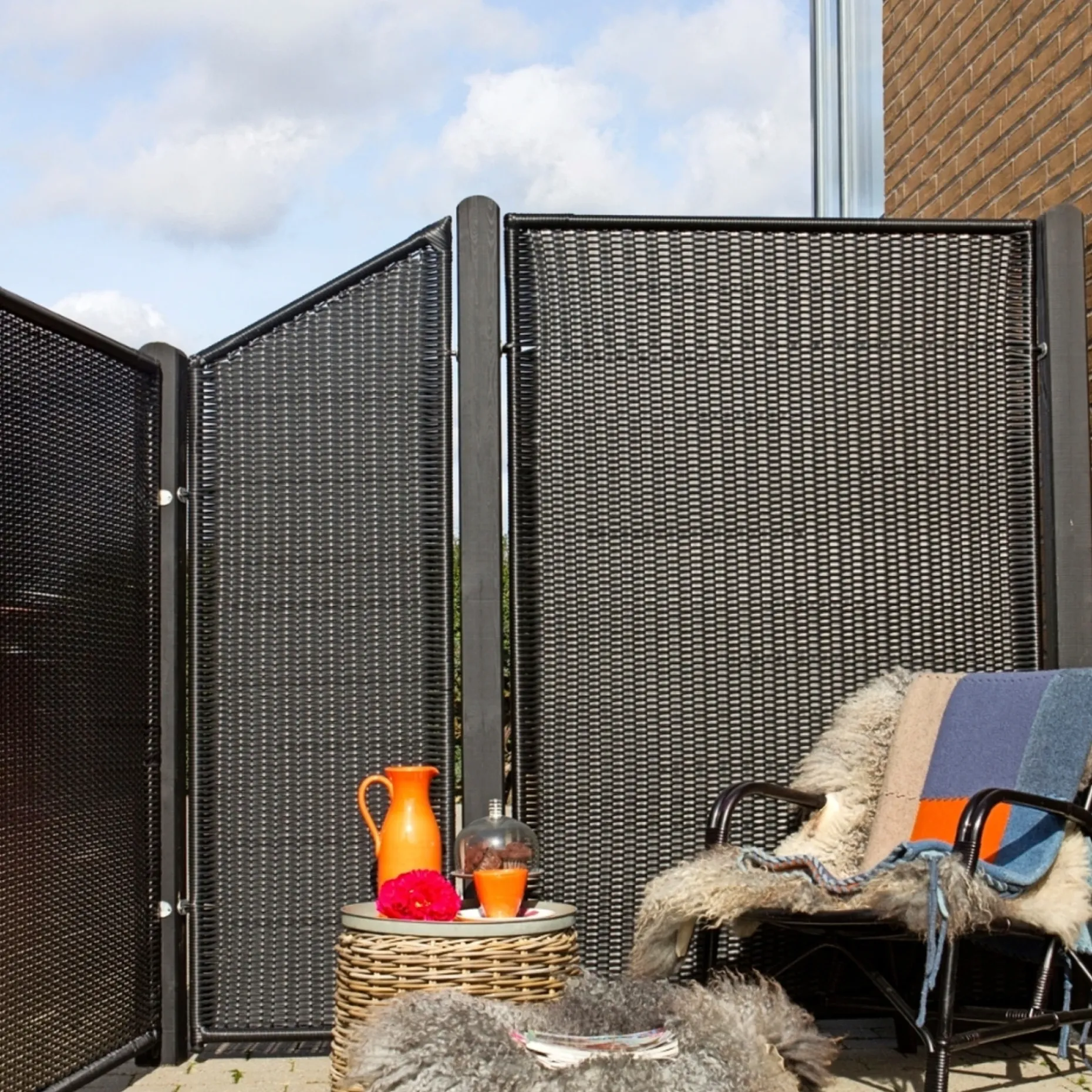 Den lukkede fletstruktur giver visuel afskærmning uden store mellemrum, og materialet tåler almindelig udendørs brug. Den sorte farve giver et neutralt, moderne udtryk, der nemt kan kombineres med træterrasser og belægninger.