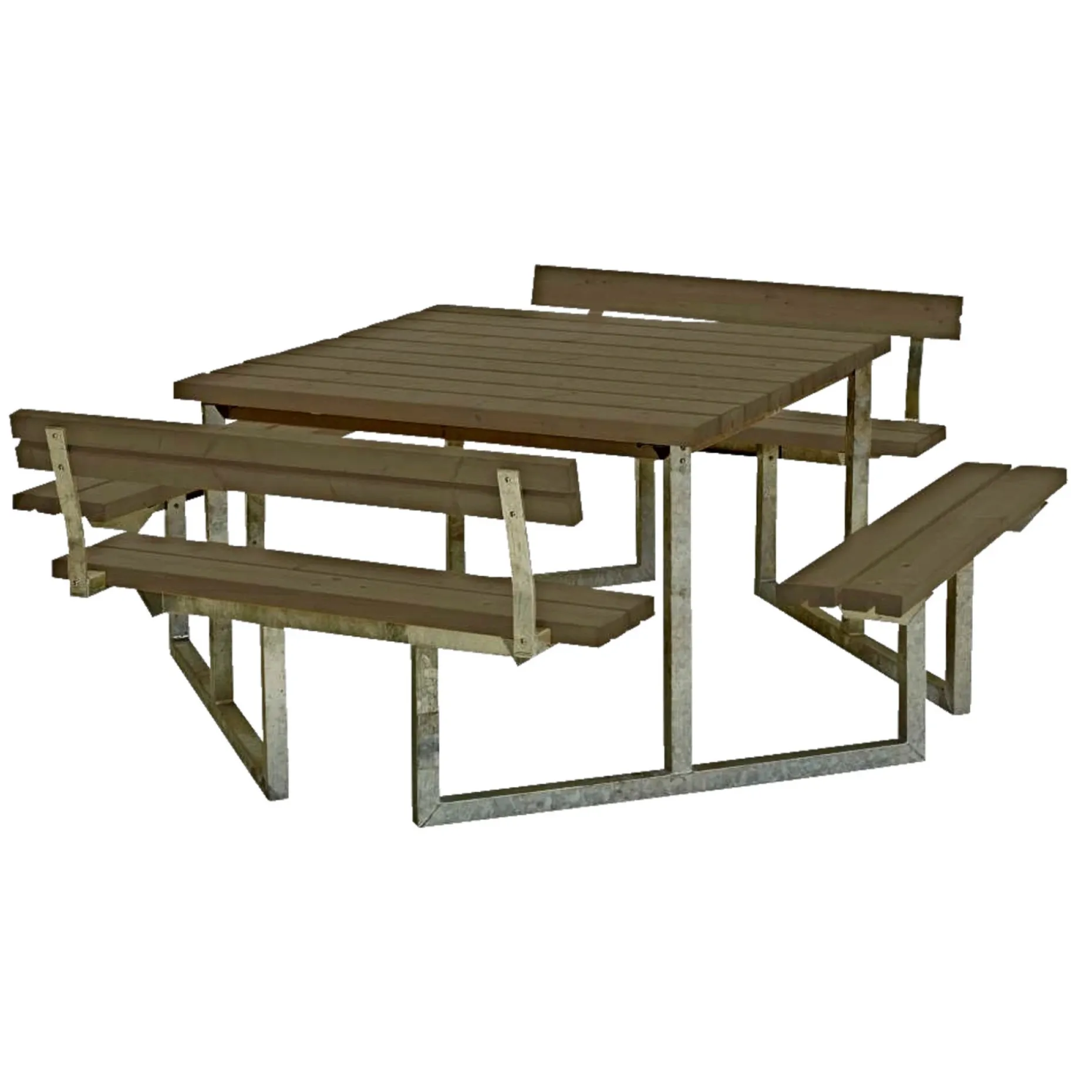 PLUS TWIST BORDBÆNKESÆT GRÅBRUNTwist Bord/Bænkesæt m/2 ryglæn – 204 cm – GråbrunVarenr. består af:1 stk. bord/bænksæt og 2 stk. ryglæn inkl. beslag.Planker:42×116 mm nåletræ.Trykimprægneret og grundmalet gråbrun.Nærmeste RAL 7023 – vandbaseret. Varenr. 19816-18.Bordplade:Længde 118 cm – bredde 118 cm – højde 73 cm.Bænke:Længde 118 cm – bredde 25 cm – højde 45 cm.Ryghøjde 76 cm.Siddepladser: 8 (2 pr. bænk).Stel/ben:45×45 mm varmgalvaniseret stål.Leveres som “Saml selv”. Trykimprægneret og grundmalet
