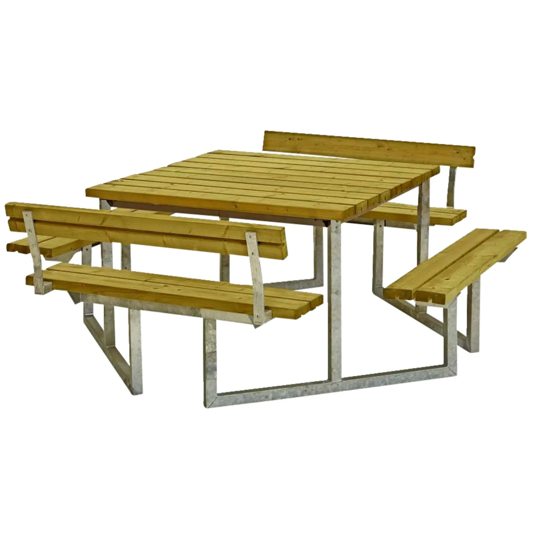 PLUS TWIST BORDBÆNKESÆT NATURTwist Bord/Bænkesæt m/2 ryglæn – 204 cm – TrykimprægneretVarenr. består af:1 stk. bord/bænksæt og 2 stk. ryglæn inkl. beslag.Planker:42×116 mm trykimprægneret nåletræ.Bordplade:Længde 118 cm – bredde 118 cm – højde 73 cm.Bænke:Længde 118 cm – bredde 25 cm – højde 45 cm.Ryghøjde 76 cm.Siddepladser: 8 (2 pr. bænk).Stel/ben:45×45 mm varmgalvaniseret stål.Leveres som “Saml selv”. Druckimprägniert Klass A/B