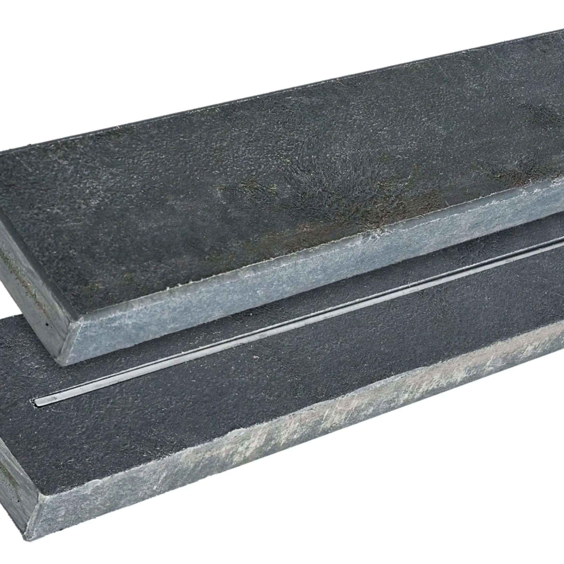 Rustik overflade og struktur. Hver planke er unik og farver kan derfor variere. Massive planker forstærket med stålprofil. Afrundede kanter. Vedligeholdelsesfrit og gennemfarvet.