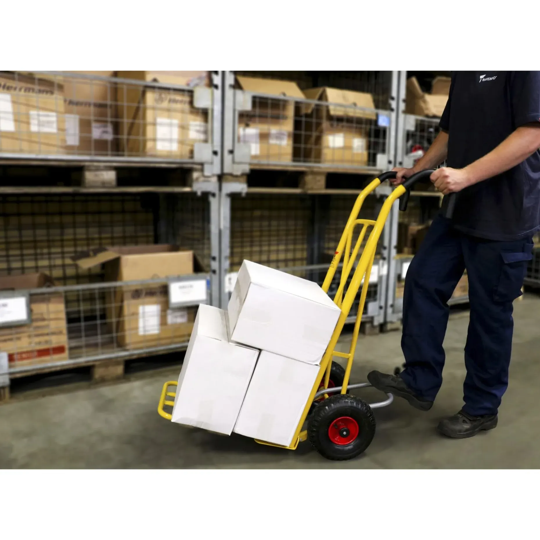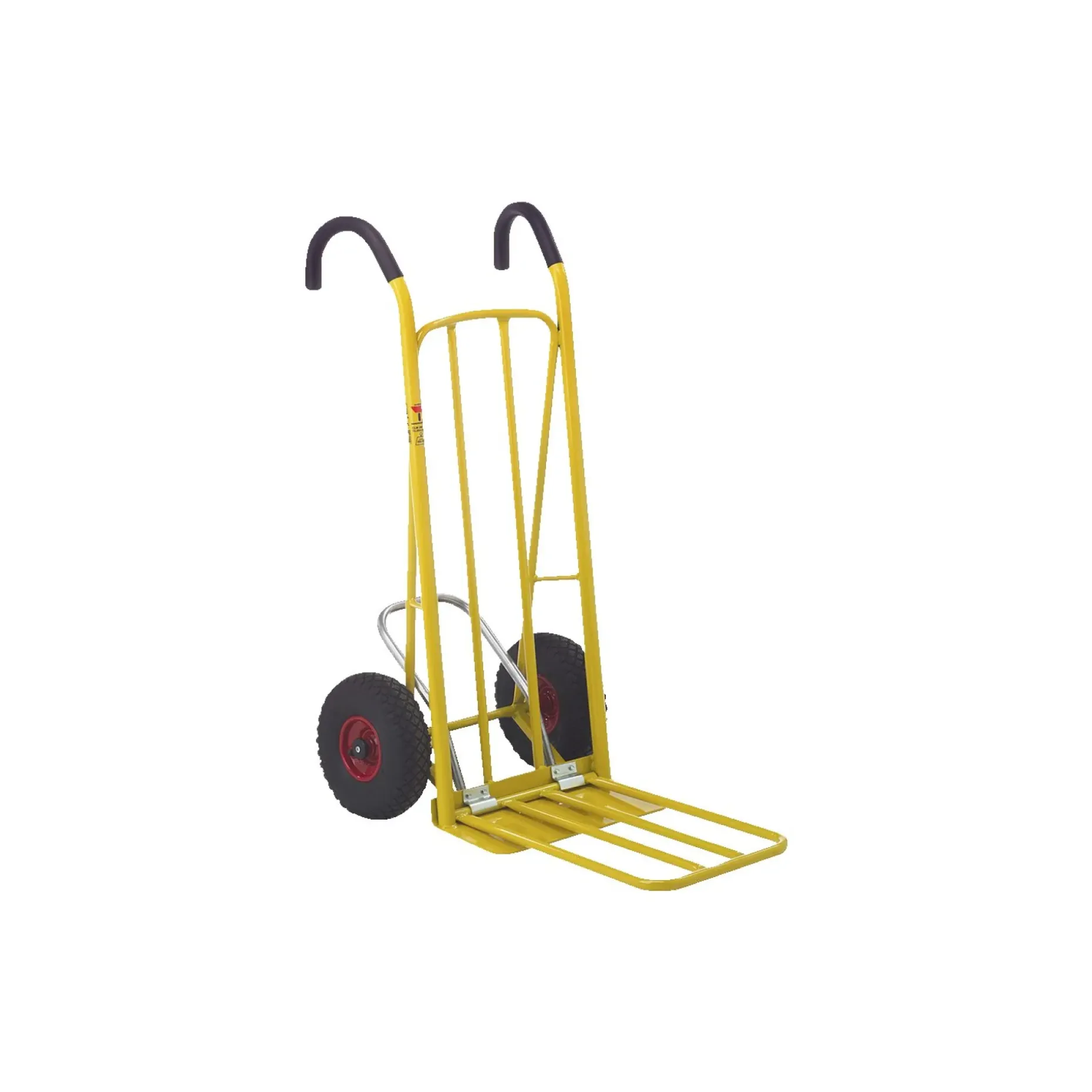 Ergonomiske håndtag giver et bedre greb og mere kontrol under transport, mens udfaldsrammen hjælper med stabil placering af sække og materialer. Vognen leveres monteret, så den er klar til brug uden samling.