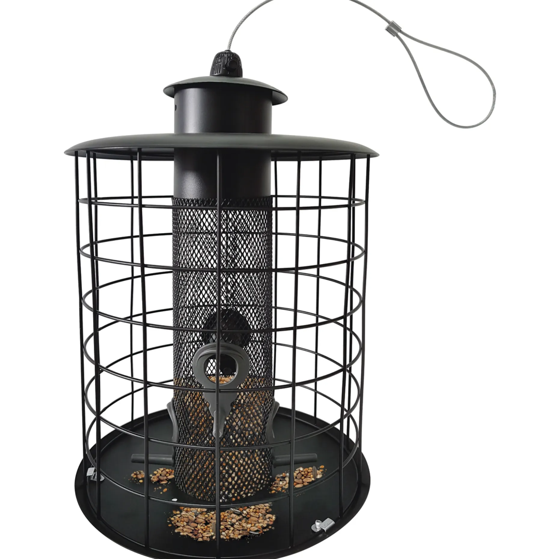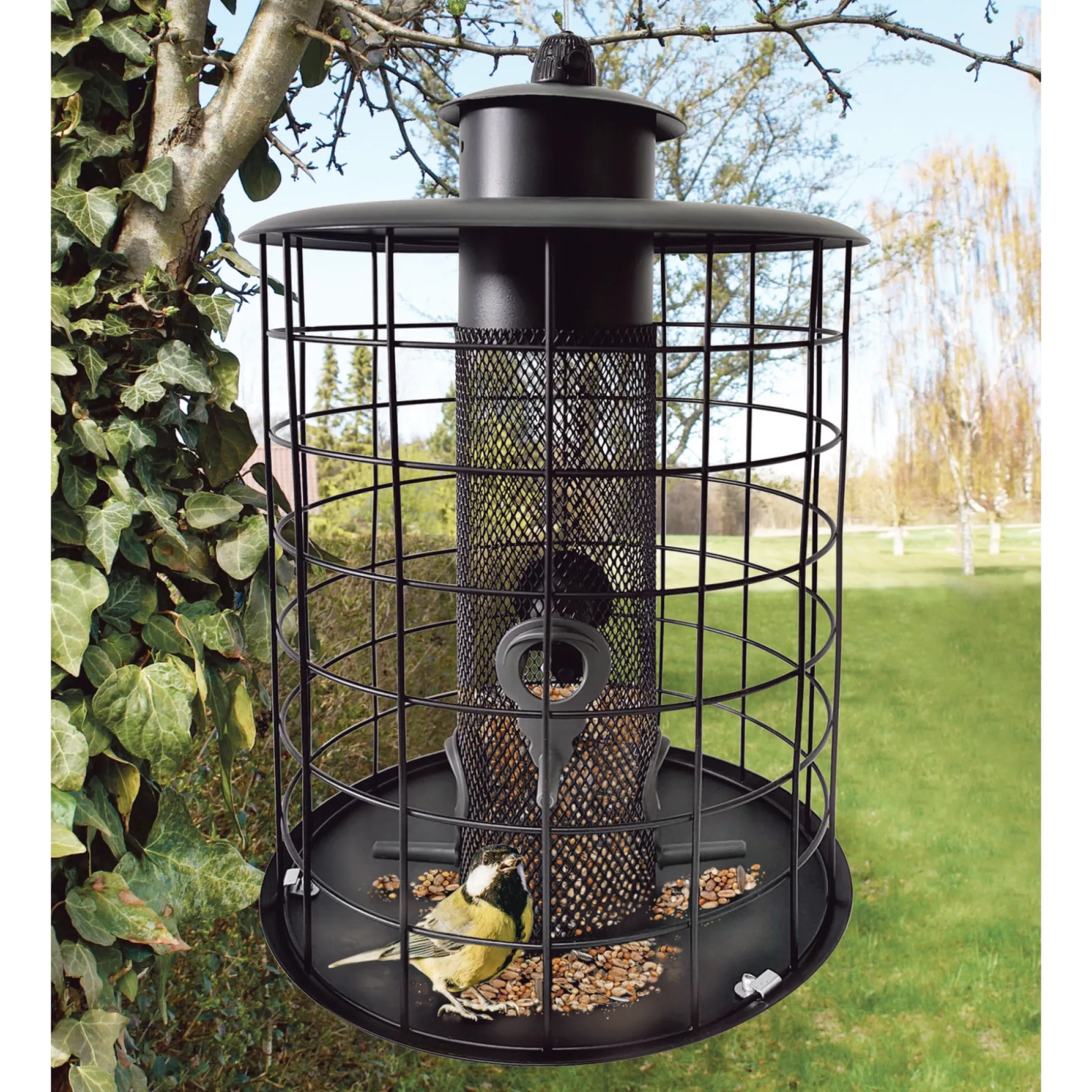 Foderautomatens yderste gitter sikrer, at småfuglene kan spise i fred og foderet ikke spises af større fugle.