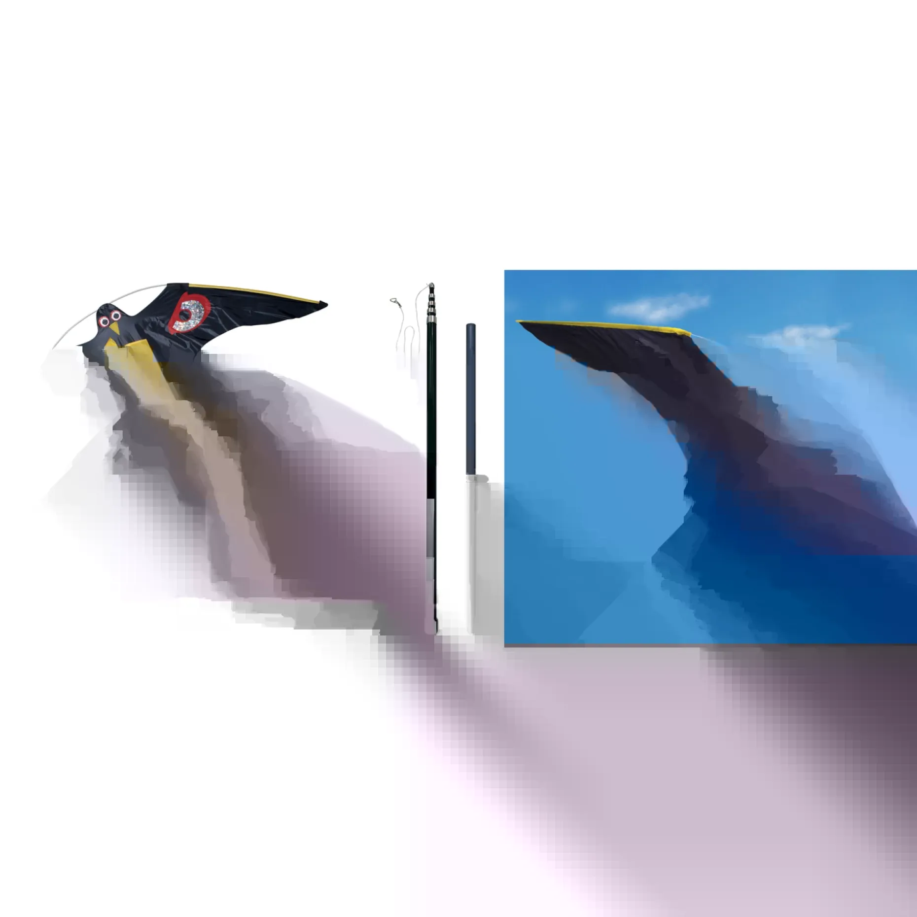 Når dragen er monteret, sættes teleskopstangen ned over jordspyddet. Ved let vind vil dragen flyve, og vil til forveksling ligne en rovfugl med et vingefang på 140 cm.